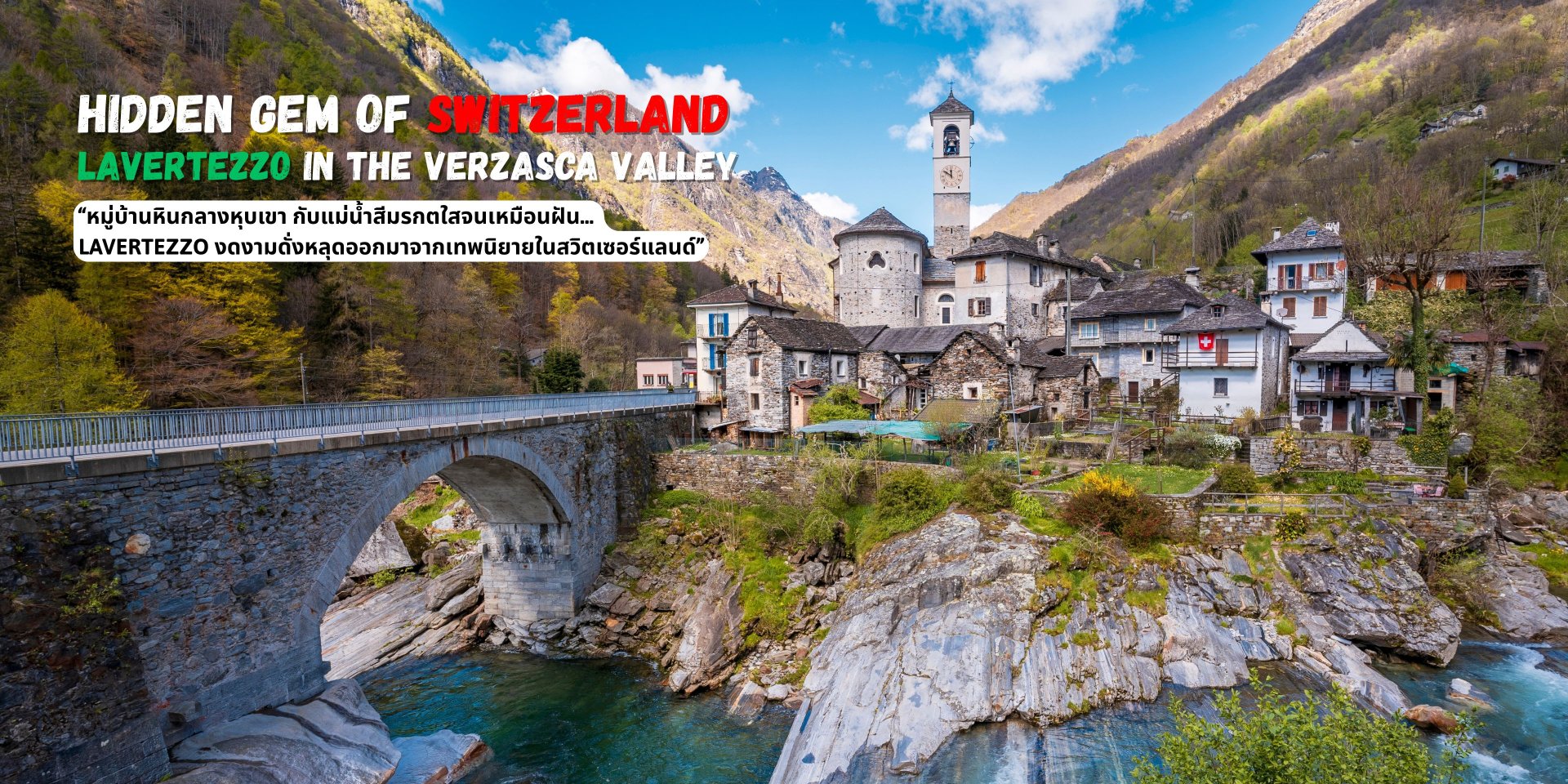 Lavertezzo คือหมู่บ้านเล็กอันเงียบสงบที่ตั้งอยู่ในหุบเขา Verzasca Valley แห่งรัฐทิชีโน (Ticino) ทางตอนใต้ของประเทศสวิตเซอร์แลนด์ พื้นที่นี้มีชื่อเสียงจากธรรมชาติบริสุทธิ์ บ้านหินเก่าแก่แบบสวิส-อิตาเลียน และแม่น้ำเวอร์ซาสก้า (Verzasca River) ที่ไหลผ่านกลางหมู่บ้าน ด้วยน้ำใสแจ๋วสีเขียวมรกตสะท้อนแสงอาทิตย์จนดูราวกับสระแก้วในเทพนิยาย