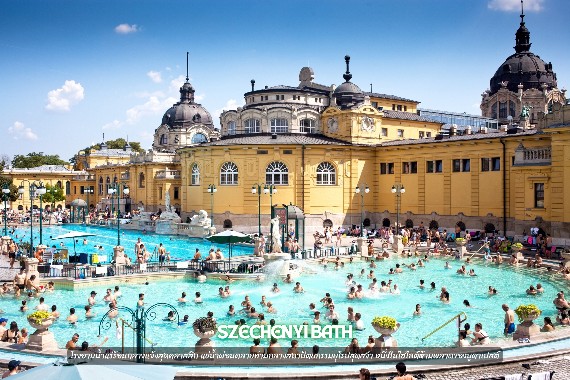 แช่น้ำแร่ที่ Széchenyi Bath: บ่อน้ำร้อนกลางแจ้งสีเหลืองมัสตาร์ดสุดคลาสสิก ใส่ชุดว่ายน้ำมาแช่น้ำอุ่นๆ ท่ามกลางอากาศเย็นๆ คือฟินมาก!