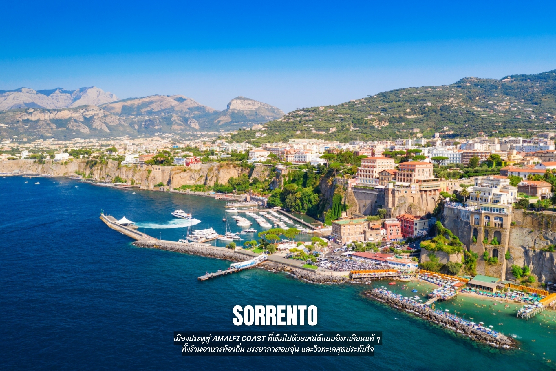 และปิดท้ายที่ Sorrento เมืองประตูสู่ Amalfi Coast ที่เต็มไปด้วยเสน่ห์แบบอิตาเลียนแท้ ๆ ทั้งร้านอาหารท้องถิ่น บรรยากาศอบอุ่น และวิวทะเลสุดประทับใจ