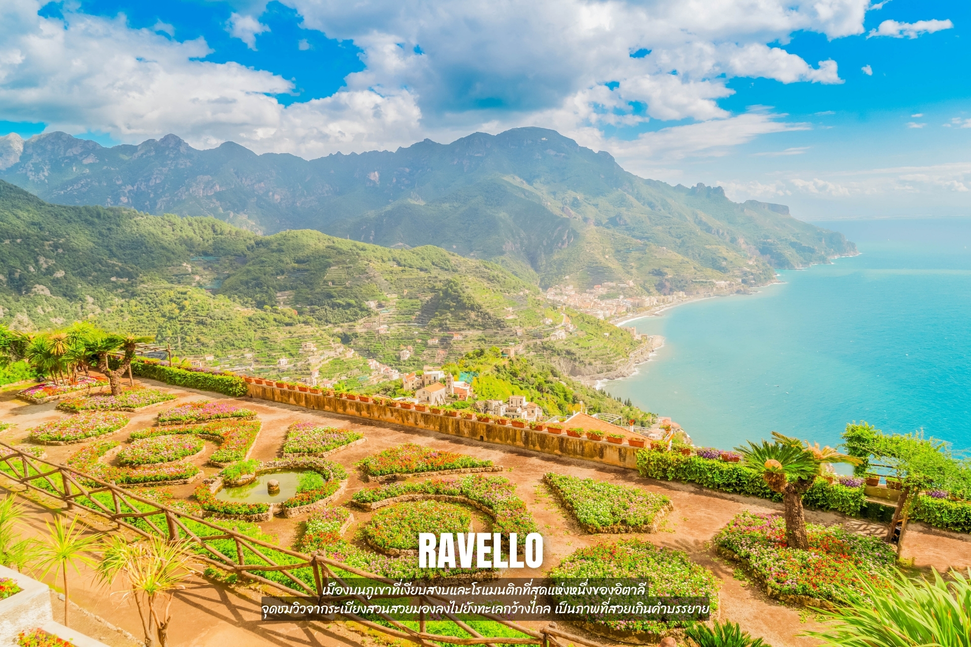 ขึ้นไปสัมผัสวิวมุมสูงที่ Ravello เมืองบนภูเขาที่เงียบสงบและโรแมนติกที่สุดแห่งหนึ่งของอิตาลี จุดชมวิวจากระเบียงสวนสวยมองลงไปยังทะเลกว้างไกล เป็นภาพที่สวยเกินคำบรรยาย
