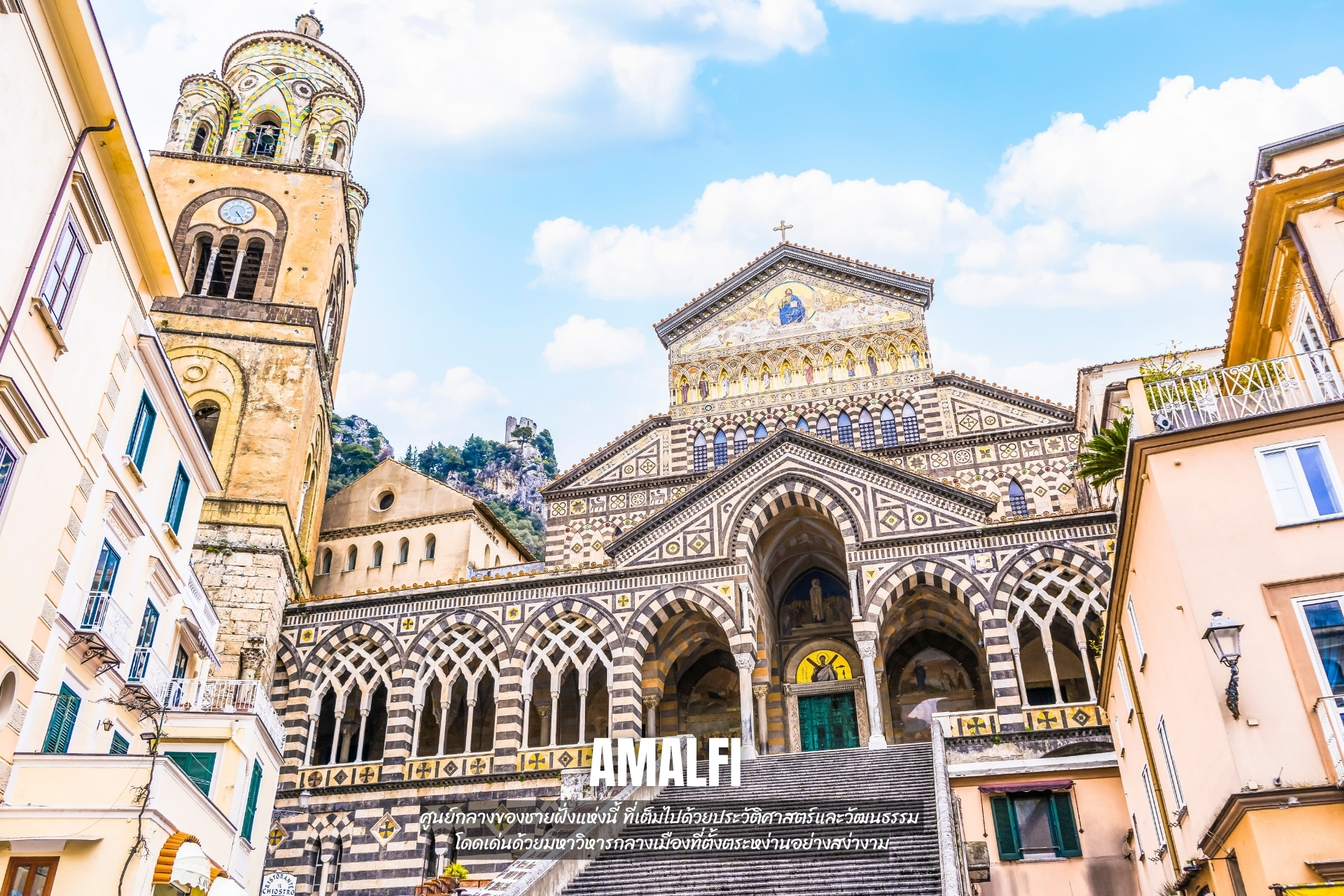 ต่อด้วยเมือง Amalfi ศูนย์กลางของชายฝั่งแห่งนี้ ที่เต็มไปด้วยประวัติศาสตร์และวัฒนธรรม โดดเด่นด้วยมหาวิหารกลางเมืองที่ตั้งตระหง่านอย่างสง่างาม