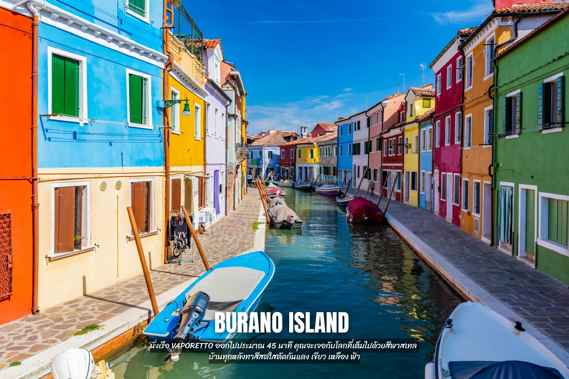 นั่งเรือ Vaporetto ออกไปประมาณ 45 นาที คุณจะเจอกับโลกที่เต็มไปด้วยสีพาสเทล บ้านทุกหลังทาสีสดใสตัดกันแดง เขียว เหลือง ฟ้า