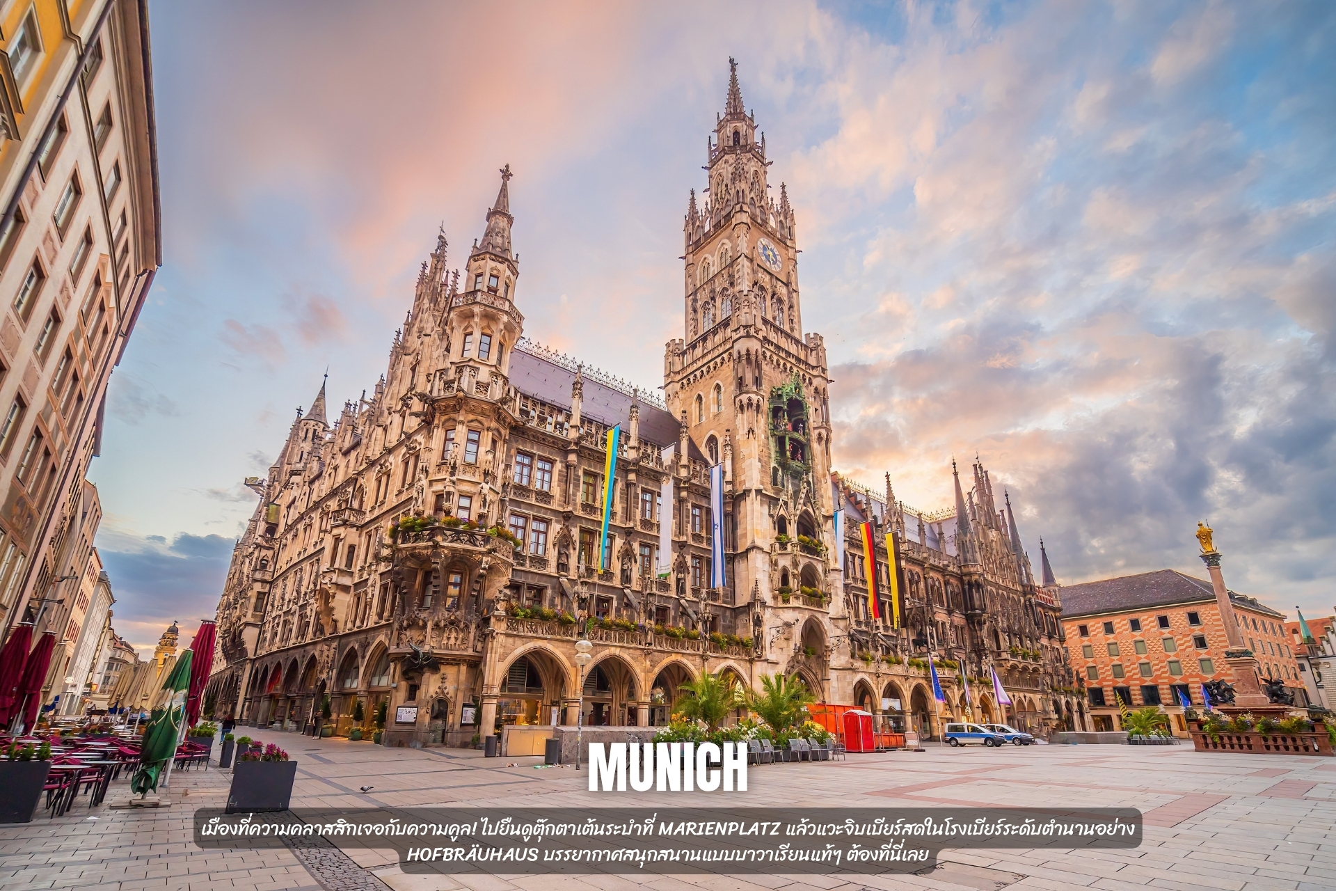 เมืองที่ความคลาสสิกเจอกับความคูล! ไปยืนดูตุ๊กตาเต้นระบำที่ Marienplatz แล้วแวะจิบเบียร์สดในโรงเบียร์ระดับตำนานอย่าง Hofbräuhaus บรรยากาศสนุกสนานแบบบาวาเรียนแท้ๆ ต้องที่นี่เลย