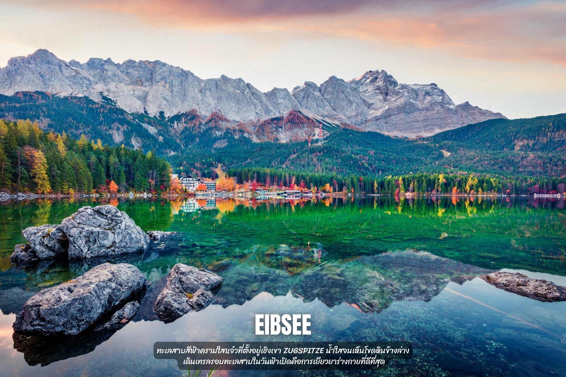 ทะเลสาบสีฟ้าครามใสแจ๋วที่ตั้งอยู่เชิงเขา Zugspitze น้ำใสจนเห็นโขดหินข้างล่าง เดินเทรลรอบทะเลสาบในวันฟ้าเปิดคือการเยียวยาร่างกายที่ดีที่สุด