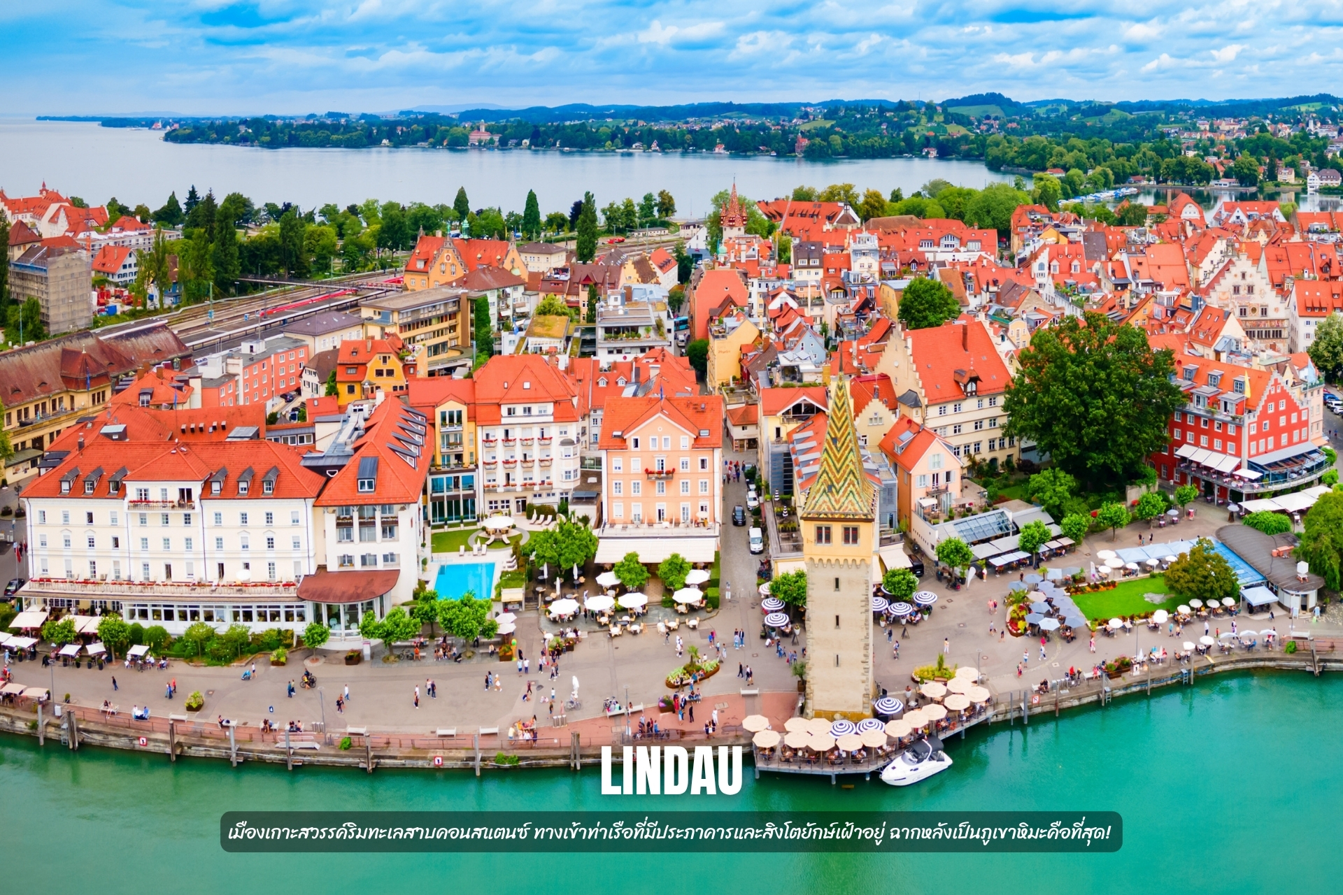 5. Lindau: เมืองเกาะสวรรค์ริมทะเลสาบคอนสแตนซ์ ทางเข้าท่าเรือที่มีประภาคารและสิงโตยักษ์เฝ้าอยู่ ฉากหลังเป็นภูเขาหิมะคือที่สุด!