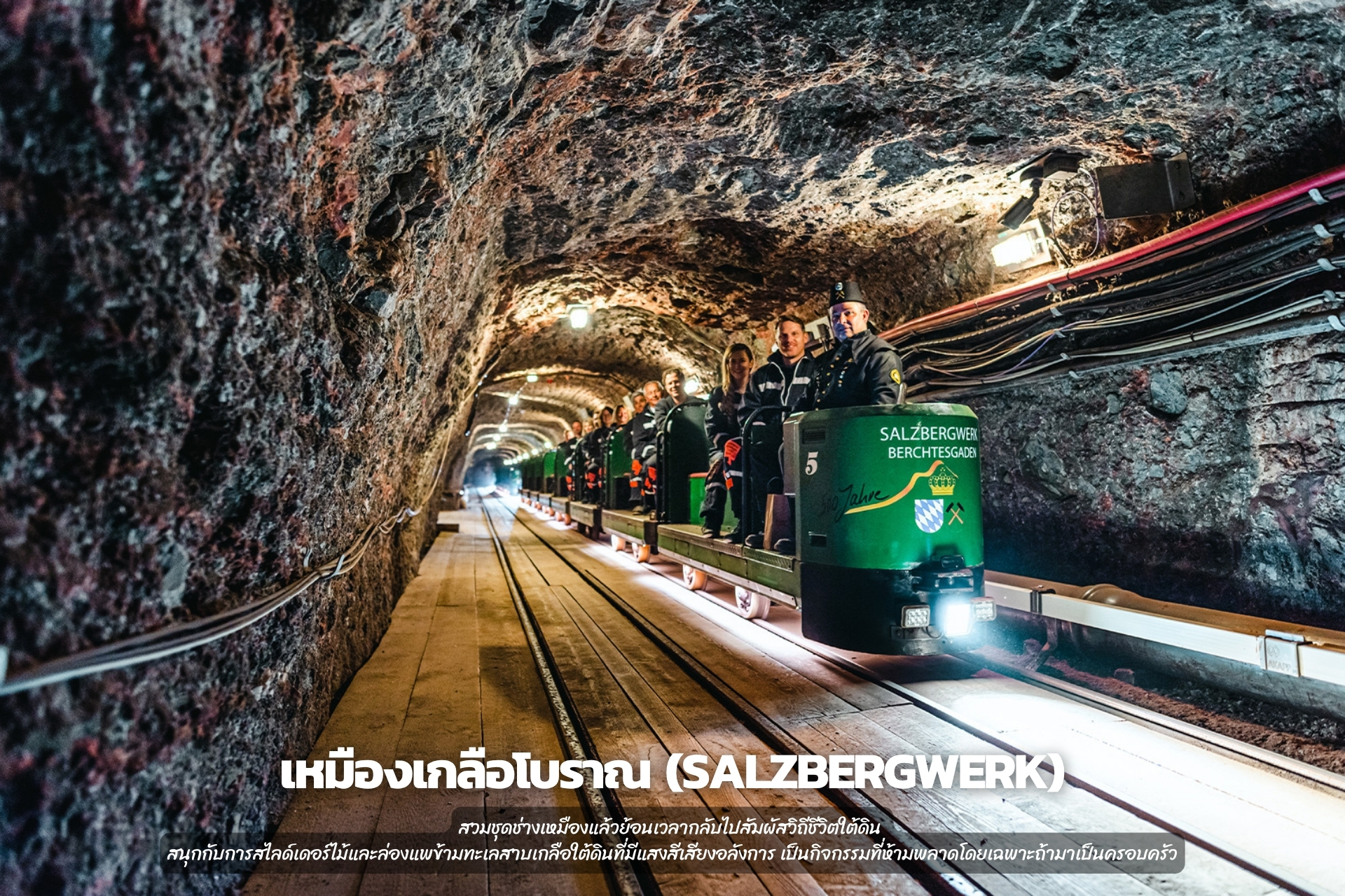 สวมชุดช่างเหมืองแล้วย้อนเวลากลับไปสัมผัสวิถีชีวิตใต้ดิน สนุกกับการสไลด์เดอร์ไม้และล่องแพข้ามทะเลสาบเกลือใต้ดินที่มีแสงสีเสียงอลังการ เป็นกิจกรรมที่ห้ามพลาดโดยเฉพาะถ้ามาเป็นครอบครัว
