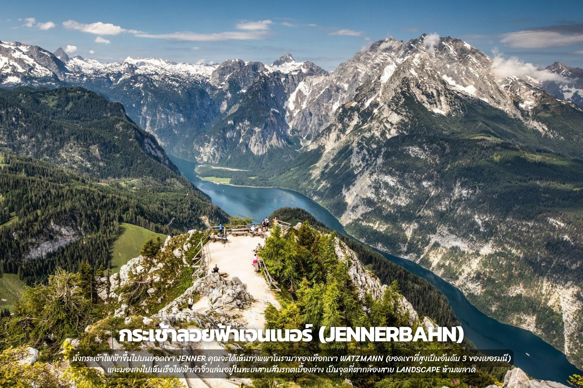 นั่งกระเช้าไฟฟ้าขึ้นไปบนยอดเขา Jenner คุณจะได้เห็นภาพพาโนรามาของเทือกเขา Watzmann (ยอดเขาที่สูงเป็นอันดับ 3 ของเยอรมนี) และมองลงไปเห็นเรือไฟฟ้าลำจิ๋วแล่นอยู่ในทะเลสาบสีมรกตเบื้องล่าง เป็นจุดที่ตากล้องสาย Landscape ห้ามพลาด