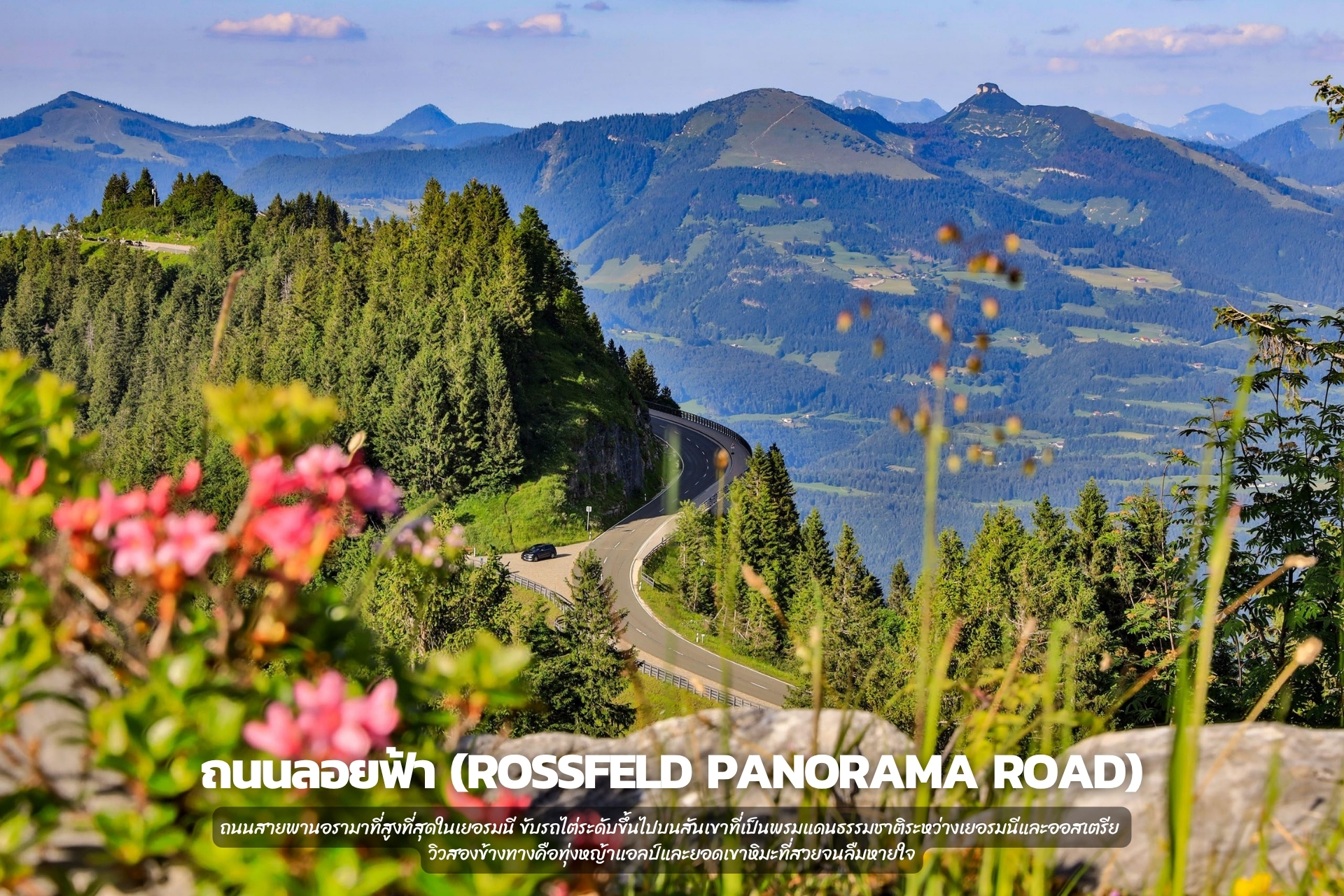 ถนนสายพานอรามาที่สูงที่สุดในเยอรมนี ขับรถไต่ระดับขึ้นไปบนสันเขาที่เป็นพรมแดนธรรมชาติระหว่างเยอรมนีและออสเตรีย วิวสองข้างทางคือทุ่งหญ้าแอลป์และยอดเขาหิมะที่สวยจนลืมหายใจ