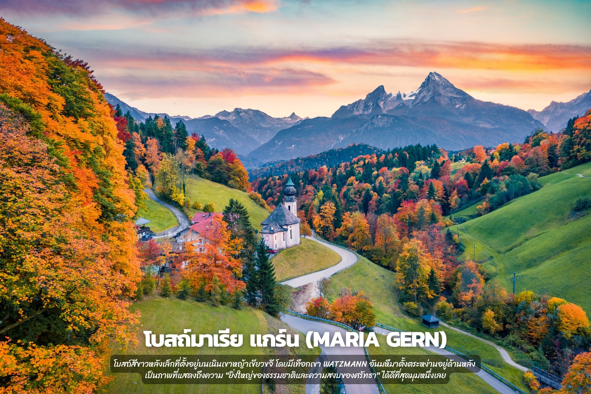 โบสถ์สีขาวหลังเล็กที่ตั้งอยู่บนเนินเขาหญ้าเขียวขจี โดยมีเทือกเขา Watzmann อันมหึมาตั้งตระหง่านอยู่ด้านหลัง เป็นภาพที่แสดงถึงความ "ยิ่งใหญ่ของธรรมชาติและความสงบของศรัทธา" ได้ดีที่สุดมุมหนึ่งเลย
