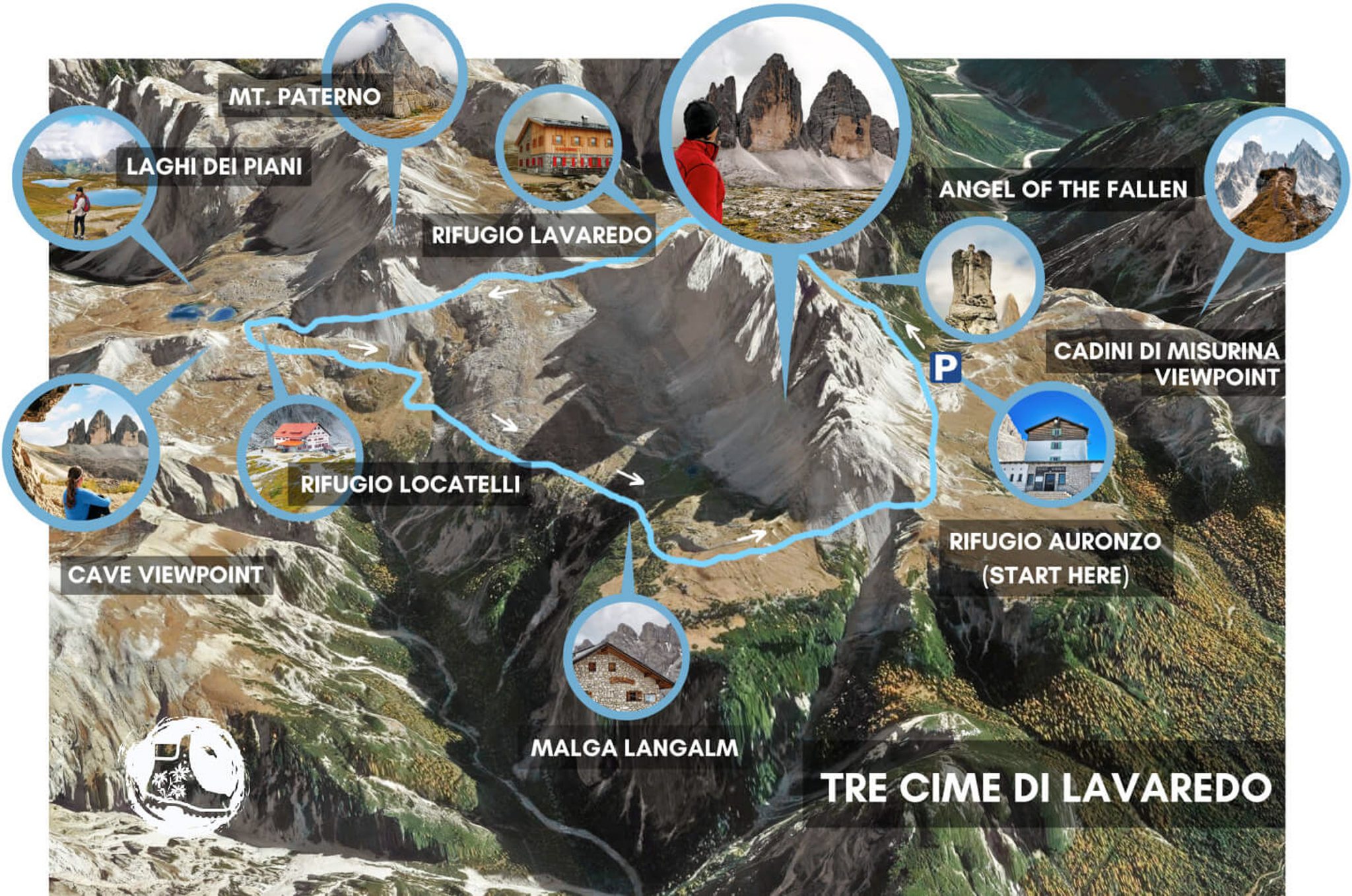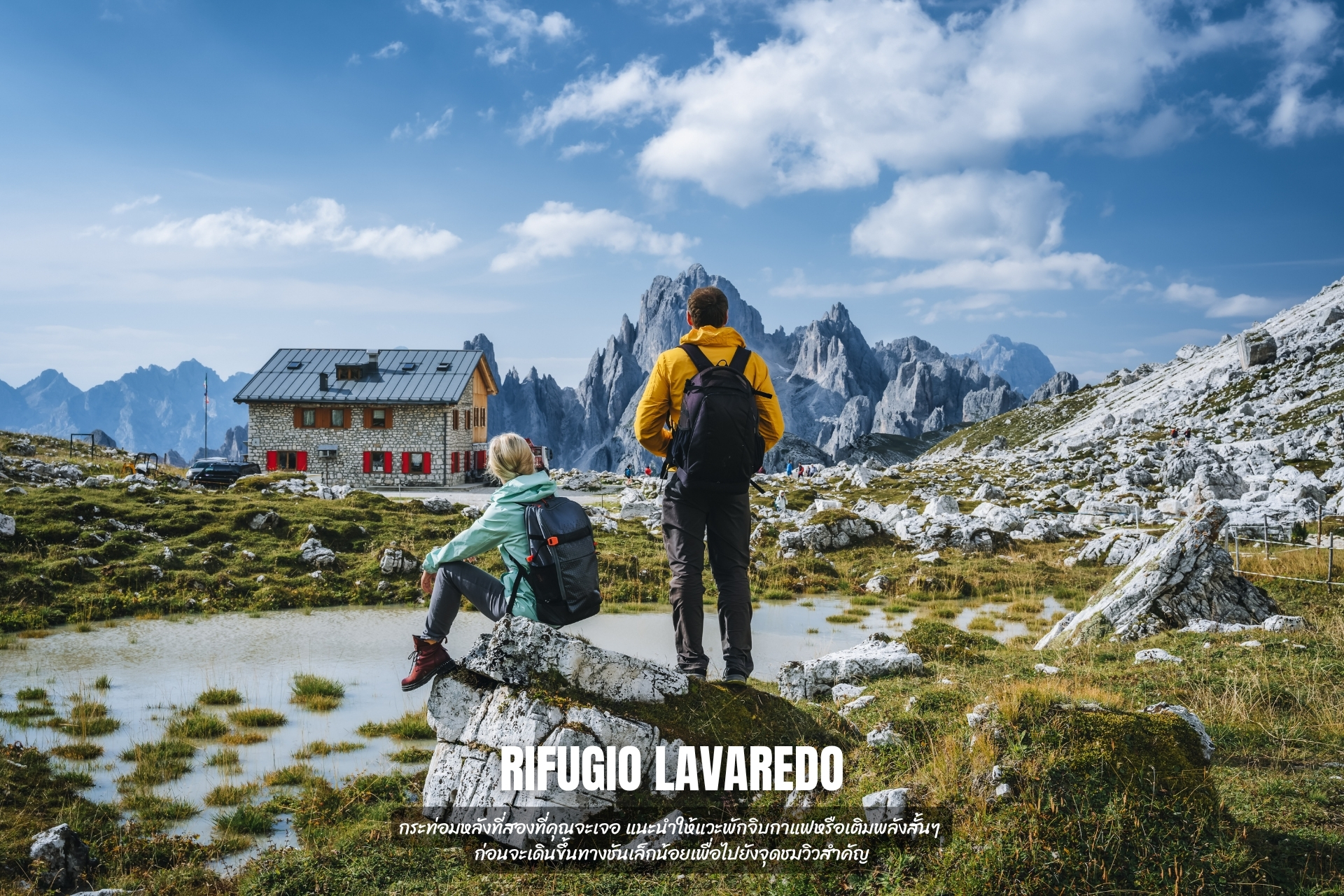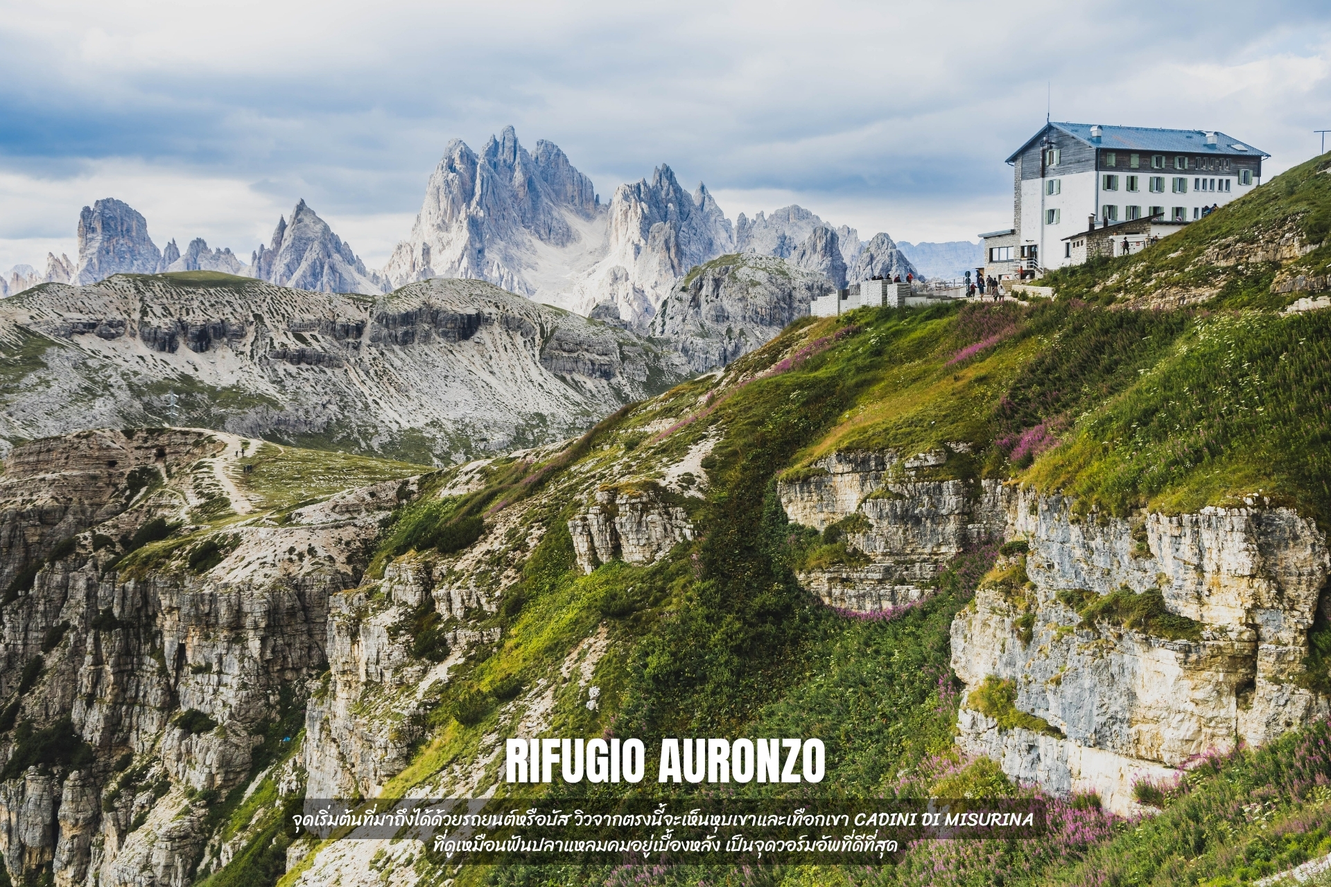 1. Rifugio Auronzo (2,333 ม.): จุดเริ่มต้นที่มาถึงได้ด้วยรถยนต์หรือบัส วิวจากตรงนี้จะเห็นหุบเขาและเทือกเขา Cadini di Misurina ที่ดูเหมือนฟันปลาแหลมคมอยู่เบื้องหลัง เป็นจุดวอร์มอัพที่ดีที่สุด
