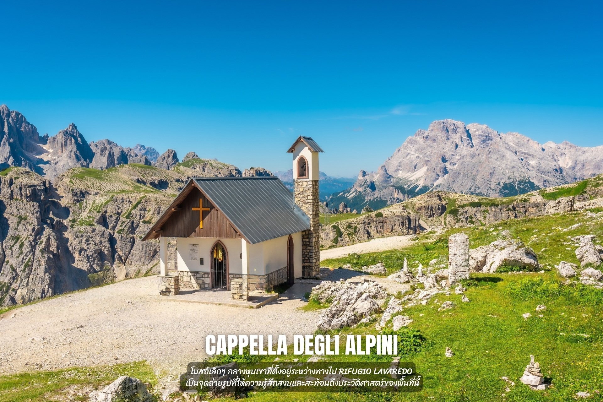2. Cappella degli Alpini: โบสถ์เล็กๆ กลางหุบเขาที่ตั้งอยู่ระหว่างทางไป Rifugio Lavaredo เป็นจุดถ่ายรูปที่ให้ความรู้สึกสงบและสะท้อนถึงประวัติศาสตร์ของพื้นที่นี้