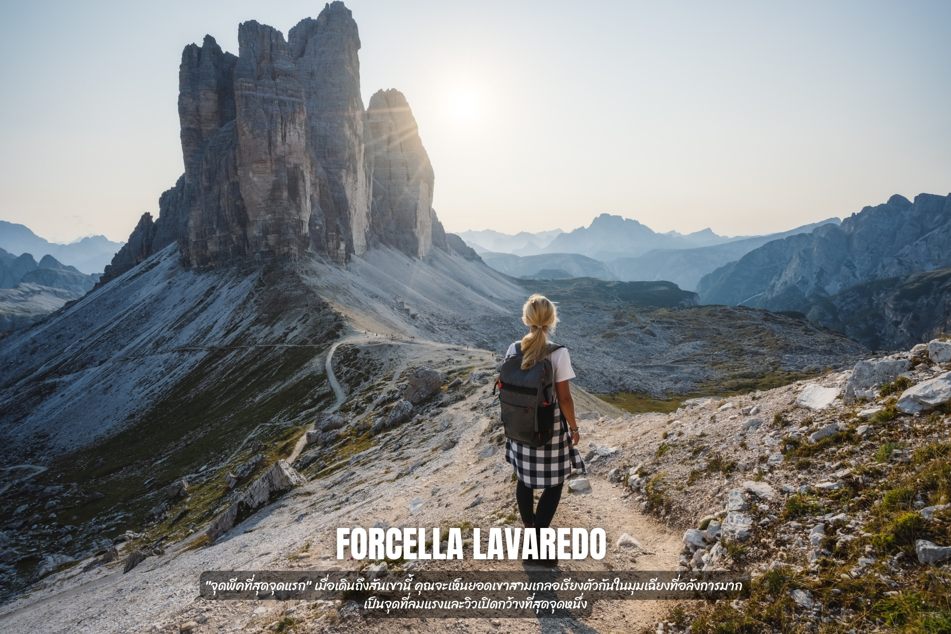 4. Forcella Lavaredo (จุดชมวิวสันเขา): "จุดพีคที่สุดจุดแรก" เมื่อเดินถึงสันเขานี้ คุณจะเห็นยอดเขาสามเกลอเรียงตัวกันในมุมเฉียงที่อลังการมาก เป็นจุดที่ลมแรงและวิวเปิดกว้างที่สุดจุดหนึ่ง
