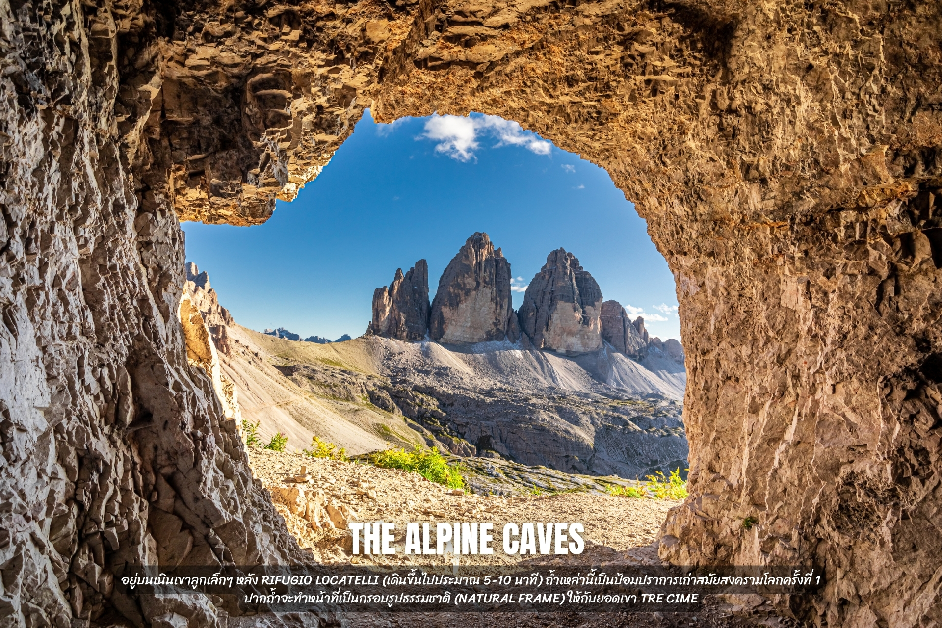6. The Alpine Caves (ถ้ำหิน): อยู่บนเนินเขาลูกเล็กๆ หลัง Rifugio Locatelli (เดินขึ้นไปประมาณ 5-10 นาที) ถ้ำเหล่านี้เป็นป้อมปราการเก่าสมัยสงครามโลกครั้งที่ 1 ปากถ้ำจะทำหน้าที่เป็นกรอบรูปธรรมชาติ (Natural Frame) ให้กับยอดเขา Tre Cime