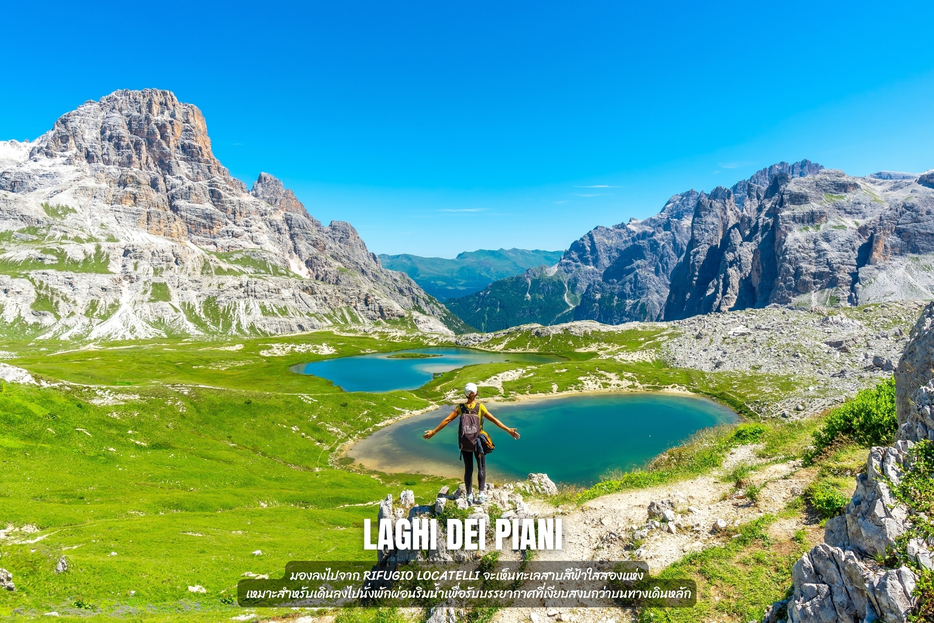 7. Laghi dei Piani (ทะเลสาบคู่): มองลงไปจาก Rifugio Locatelli จะเห็นทะเลสาบสีฟ้าใสสองแห่ง เหมาะสำหรับเดินลงไปนั่งพักผ่อนริมน้ำเพื่อรับบรรยากาศที่เงียบสงบกว่าบนทางเดินหลัก