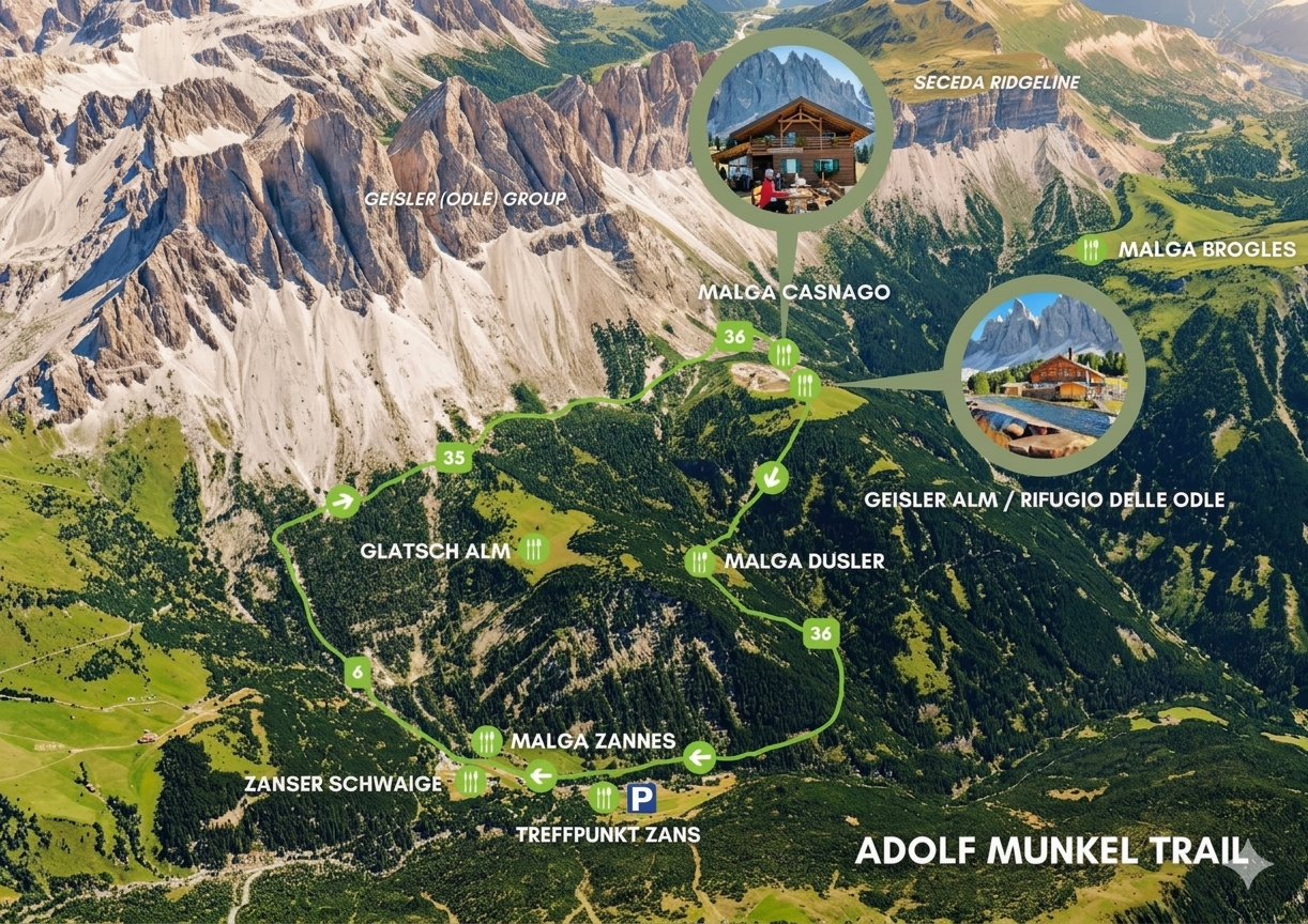 หลายคนขนานนามเทือกเขา Odle (Geisler Group) ว่าเป็น "ฟันเลื่อยของพระเจ้า" ด้วยยอดเขาหินปูนที่แหลมคมพุ่งทะยานสู่ท้องฟ้า ตัดกับความนุ่มนวลของทุ่งหญ้า Alpine สีเขียวขจีเบื้องล่าง และจุดที่ดีที่สุดในการซึมซับภาพตรงหน้านี้ ไม่ใช่แค่การมองผ่านหน้าต่างรถโค้ช แต่คือการก้าวเท้าเดินลัดเลาะไปตามเส้นทาง Adolf Munkel Trail เพื่อมุ่งหน้าสู่ Geisler Alm