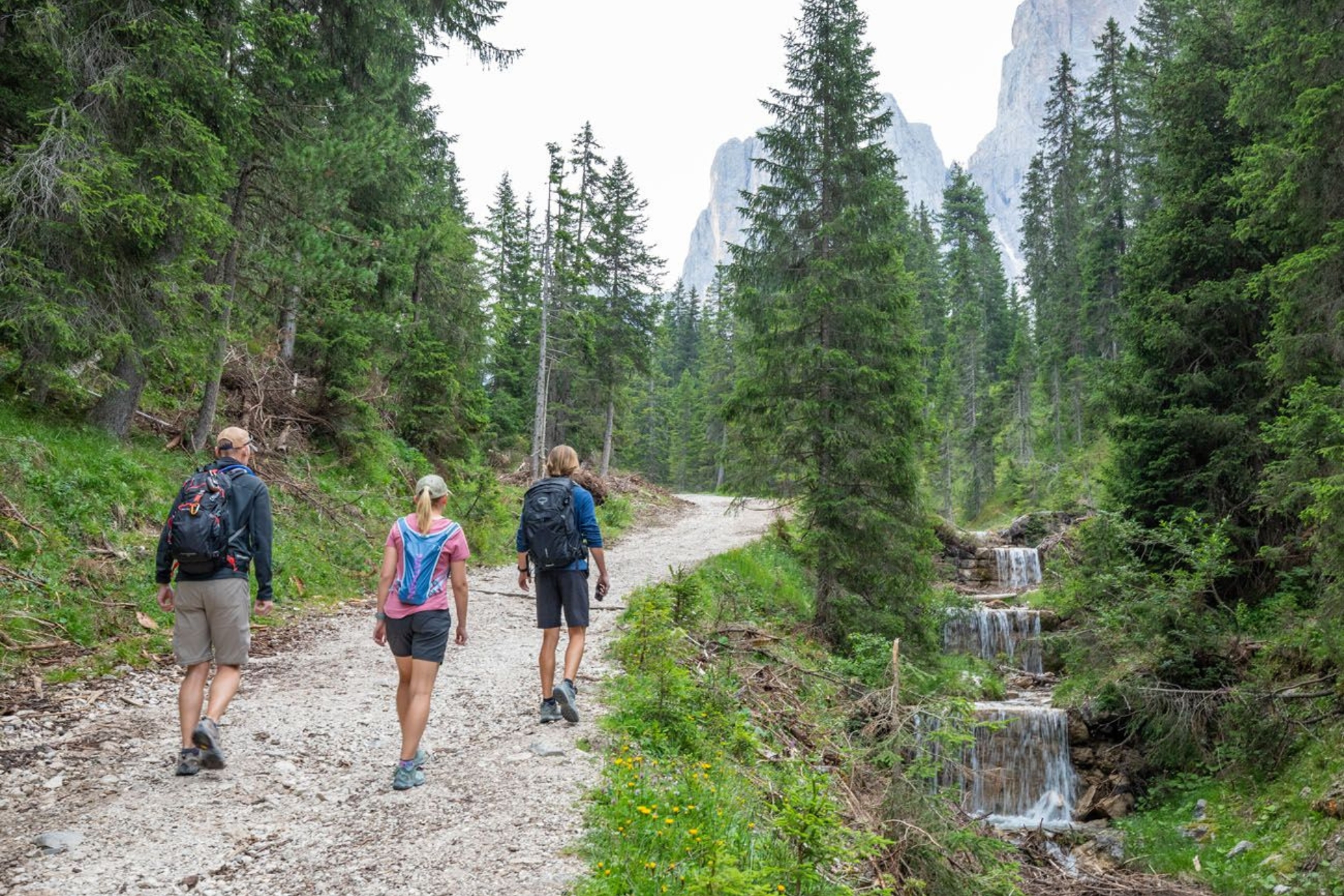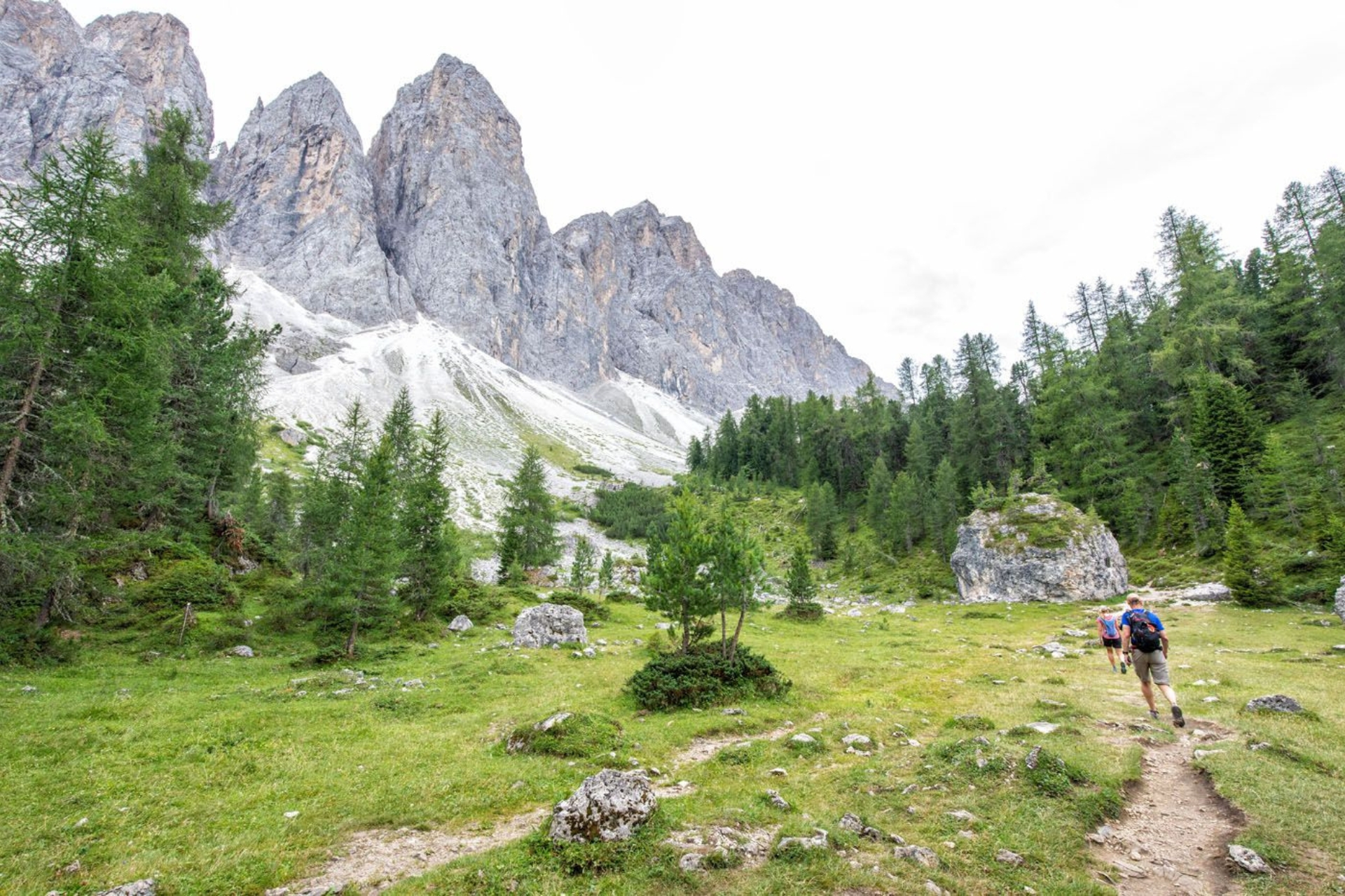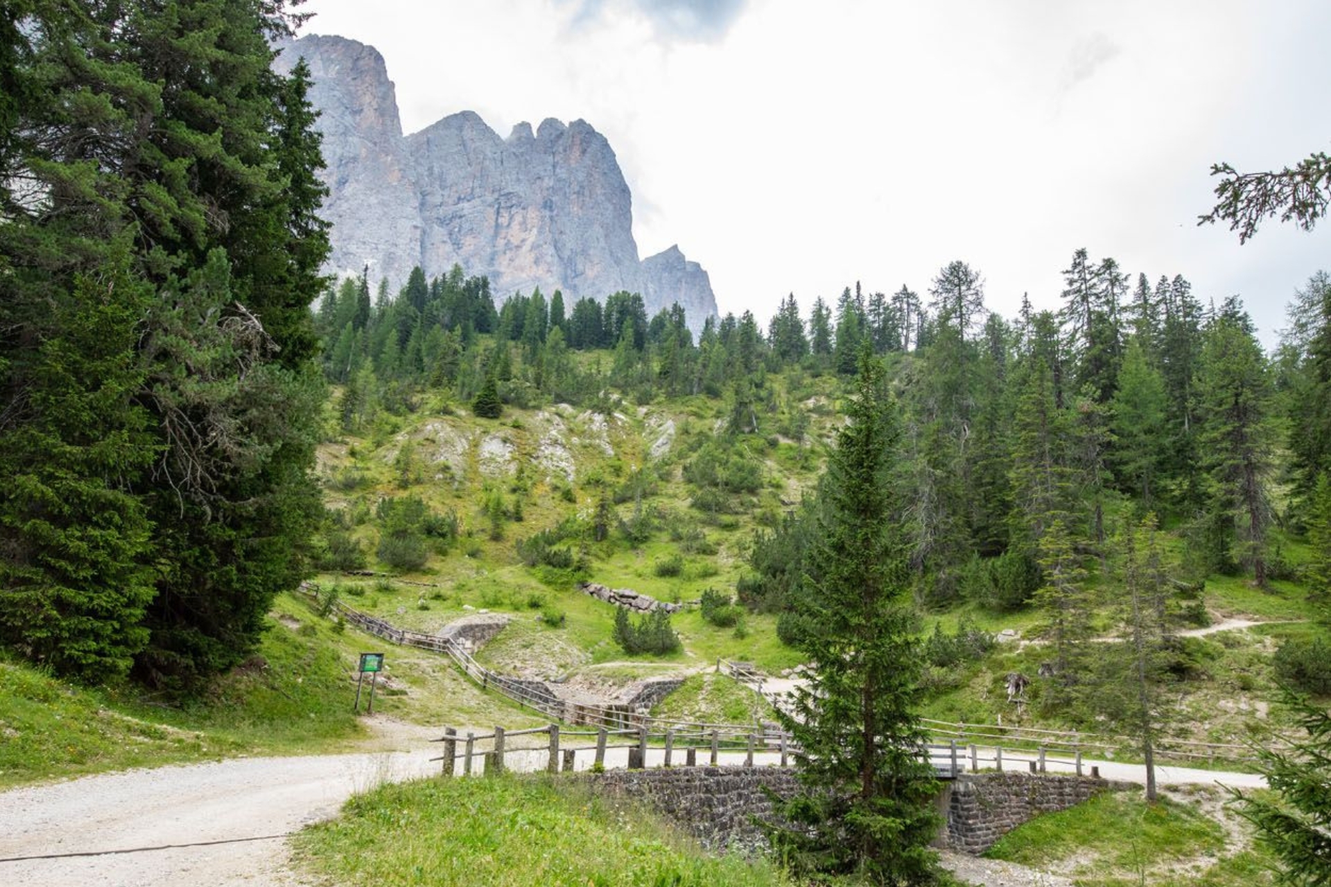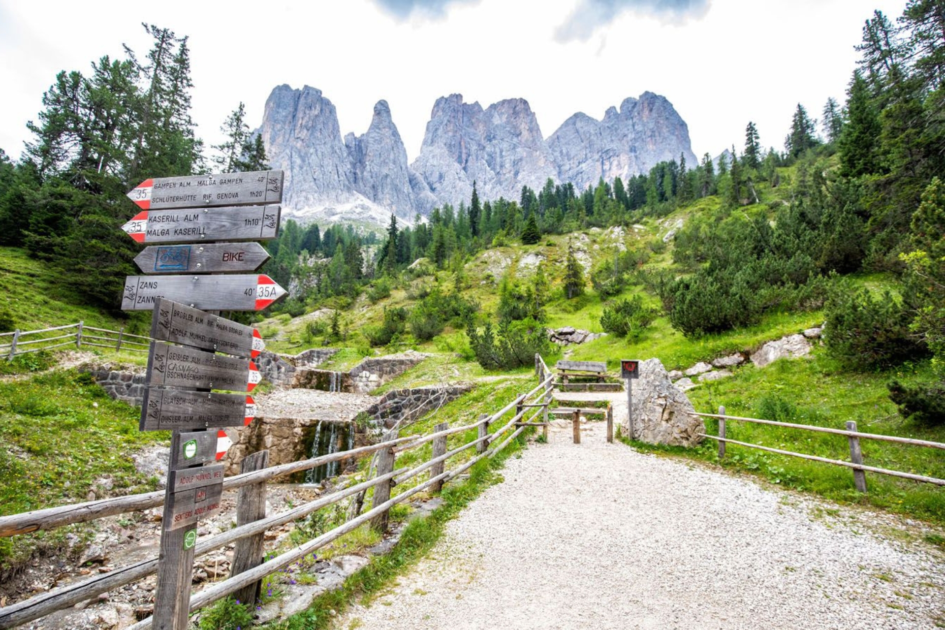 Highlight: เมื่อข้ามสะพานไม้เล็กๆ คุณจะเข้าสู่เส้นทางหมายเลข 35 ซึ่งเป็นหัวใจของทริปนี้ เส้นทางจะเริ่มเปิดโล่ง และคุณจะเห็น ยอดเขา Odle ตั้งตระหง่านอยู่ทางซ้ายมือในระยะที่ใกล้จนตกตะลึง