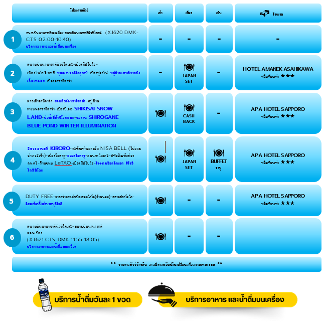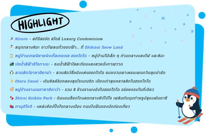 ฮอกไกโด เมืองซัปโปโร เมืองโนโบริเบทสึ หุบเขานรกจิโกกุดานิ เมืองฟุราโน่ หมู่บ้านเทพนิยายนิงเกิ้ลเทอเรส เมืองอาซาฮิคาว่า ศาลเจ้าคามิกาว่า สวนสัตว์อาซาฮิยาม่า หมู่บ้านราเมนฮาซาฮิคาว่า เมืองบิเอะ SHIKISAI SNOW LAND บ่อน้ำสีฟ้าชิโรกาเนะ ชมงาน SHIROGANE BLUE POND WINTER ILLUMINATION อิสระลานสกี KIRORO ระฆังแห่งความรัก NISA BELL เมืองโอตารุ คลองโอตารุ ถนนซาไกมาจิ พิพิธภัณฑ์กล่องดนตรี ร้านขนม LeTAO เมืองซัปโปโร โรงงานช็อคโกแลต ชิโรอิ โคอิบิโตะ DUTY FREE ศาลาว่าการเก่าเมืองฮอกไกโด ตลาดปลาโจไก อิสระช้อปปิ้งย้านทานุกิโคจิ
