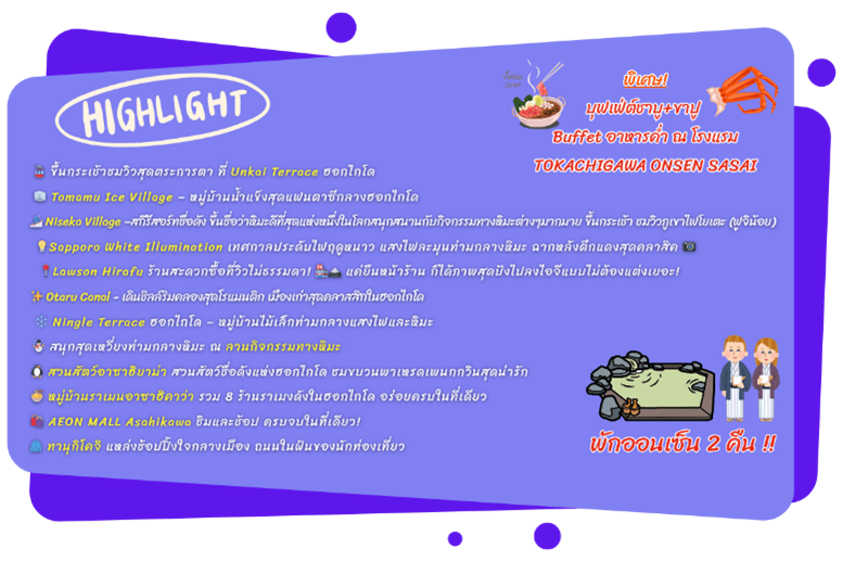 พักออนเซ็น 2 คืน, โทมามุ,ขึ้นกระเช้า UNKAI GONDOLA, จุดชมวิว UNKAI TERRACE, TOMAMU ICE VILLAGE, เมืองอิเคดะ, โรงบ่มไวน์อิเคดะ, เมืองบิเอะ, ลานกิจกรรมทางหิมะ, เมืองฟุราโน่, หมู่บ้านเทพนิยายนิงเกิ้ลเทอเรส, เมืองอาซาฮิคาว่า, อิออนมอลล์อาซาฮิคาว่า, ศาลเจ้าคามิกาว่า, สวนสัตว์อาซาฮิยาม่า, ราเมนวิลเลจ, เมืองซัปโปโร-DUTY FREE, ศาลาว่าการเมืองฮอกไกโดหลังเก่า (ด้านนอก), งานประดับไฟ SAPPORO WHITE ILLMINATION, นิเซโกะ-NISEKO VILLAGE-NISEKO GONDOLA, LAWSON ภูเขาไฟโยเตะ (ฟูจิน้อย), เมืองโอตารุ, คลองโอตารุ, ถนนซาไกมาจิ, พิพิธภัณฑ์กล่องดนตรี, ร้านขนม LeTao, อิสระช้อปปิ้งย่านทานุกิโคจิ