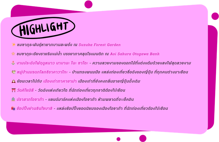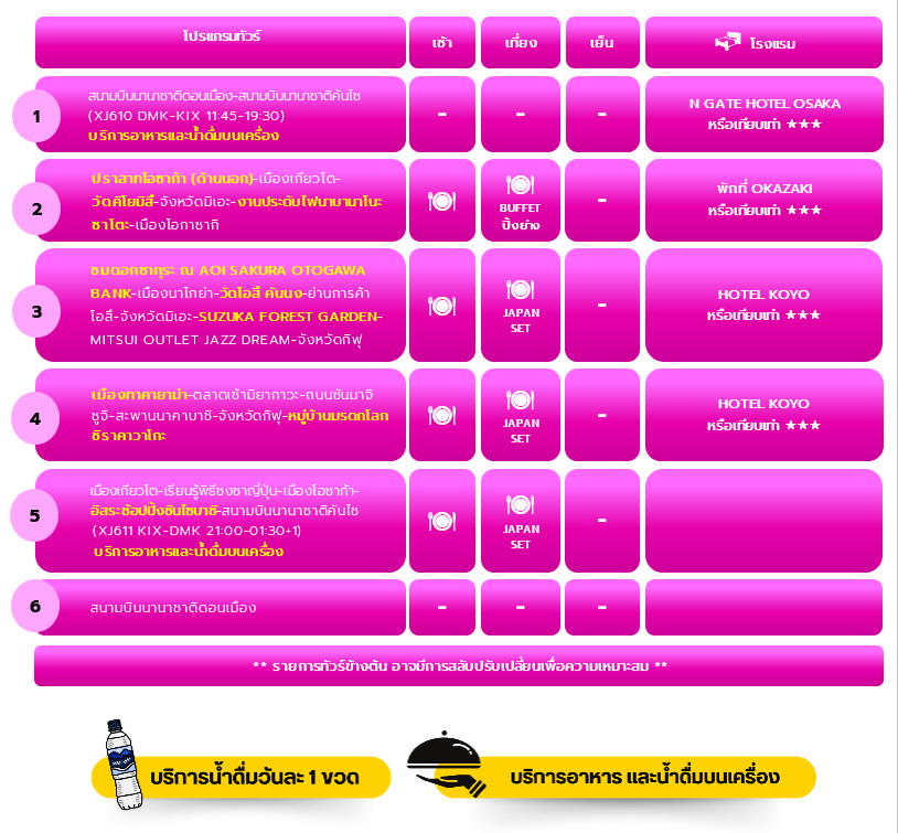 ปราสาทโอซาก้า เมืองเกียวโต วัดคิโยมิสึ จังหวัดมิเอะ งานประดับไฟนาบานาโนะ ซาโตะ เมืองโอกาซากิ ชมดอกซากุระ ณ AOI SAKURA OTOGAWA BANK เมืองนาโกย่า วัดโอสึ คันนง ย่านการค้าโอสึ จังหวัดมิเอะ SUZUKA FOREST GARDEN MITSUI OUTLET JAZZ DREAM จังหวัดกิฟุ เมืองทาคายาม่า ตลาดเช้ามิยากาวะ ถนนซันมาจิซูจิ สะพานนาคาบาชิ จังหวัดกิฟุ หมู่บ้านมรดกโลกชิราคาวาโกะ เมืองเกียวโต เรียนรู้พิธีชงชาญี่ปุ่น เมืองโอซาก้า อิสระช้อปปิ้งชินไซบาชิ