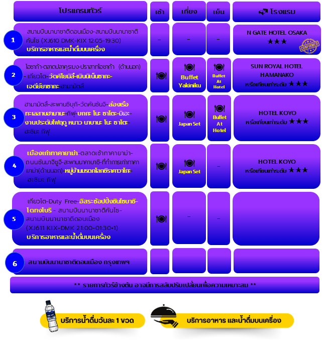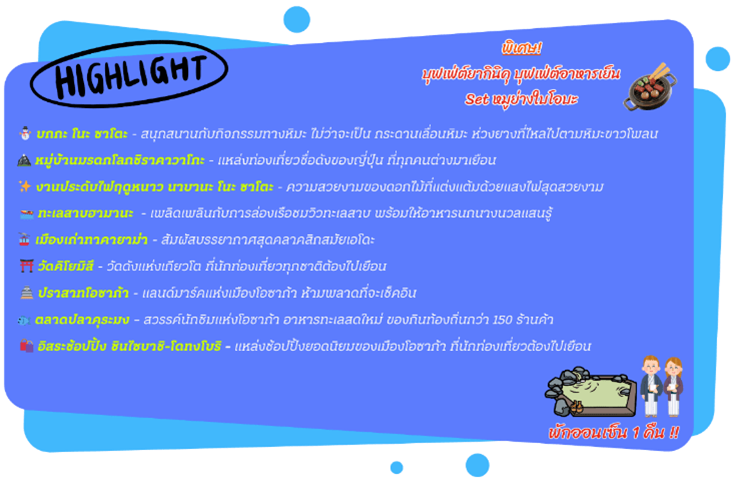 ตลาดปลาคุระมง, ปราสาทโอซาก้าด้านนอก, วัดคิโยมิสึ, เนินนิเน็นซากะ, เจดีย์ยาซากะ, ฮามามัตสึ, สะพานชิบุกิ, วัดคันซันจิ, ล่องเรือทะเลสาบฮามานะ, บกกะ โนะ ซะโตะ, งานประดับไฟฤดูหนาว นาบานะ โนะ ซาโตะ, เมืองเก่าทาคายาม่า, ตลาดเช้าทาคายาม่า, ถนนซันมาจิซูจิ, สะพานนาคาบาชิ, ที่ทำการเก่าทาคายาม่าด้านนอก, หมู่บ้านมรดกโลกชิราคาวาโกะ, Duty Free, อิสระช้อปปิ้งชินไซบาชิ, โดทงโบริ