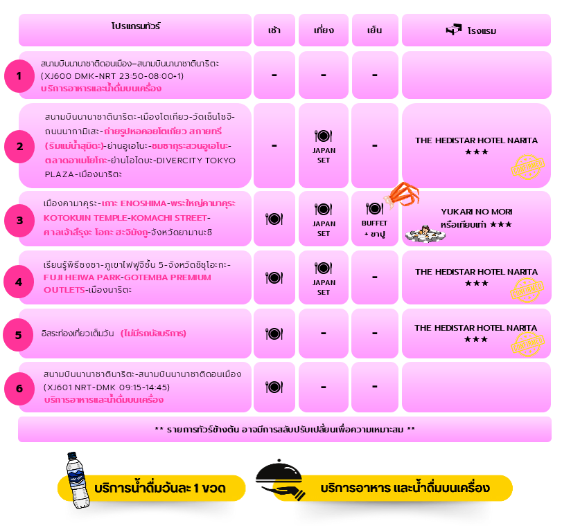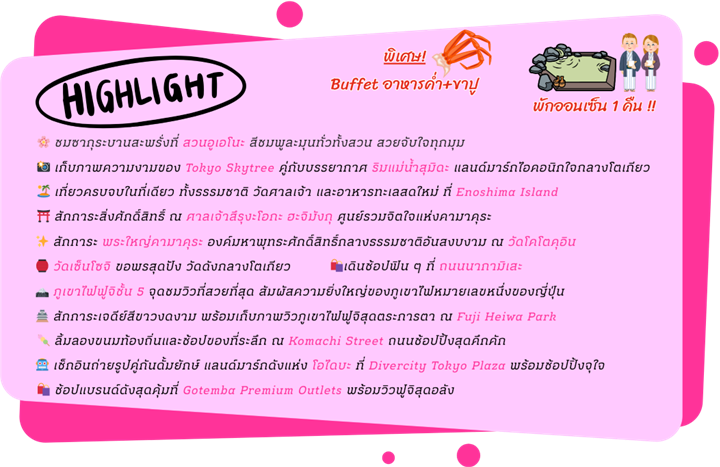 เมืองโตเกียว วัดเซ็นโซจิ ถนนนากามิเสะ ถ่ายรูปหอคอยโตเกียว สกายทรี ริมแม่น้ำสุมิดะ ย่านอูเอโนะ ชมซากุระสวนอูเอโนะ ตลาดอาเมโยโกะ ย่านโอไดบะ DIVERCITY TOKYO PLAZA เมืองนาริตะ เมืองคามาคุระ เกาะ ENOSHIMA พระใหญ่คามาคุระ KOTOKUIN TEMPLE KOMACHI STREET ศาลเจ้าสึรุงะ โอกะ ฮะจิมังกู จังหวัดยามานะชิ เรียนรู้พิธีชงชา ภูเขาไฟฟุจิชั้น 5 จังหวัดชิซุโอะกะ FUJI HEIWA PARK GOTEMBA PREMIUM OUTLETS เมืองนาริตะ อิสระท่องเที่ยวเต็มวัน