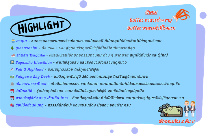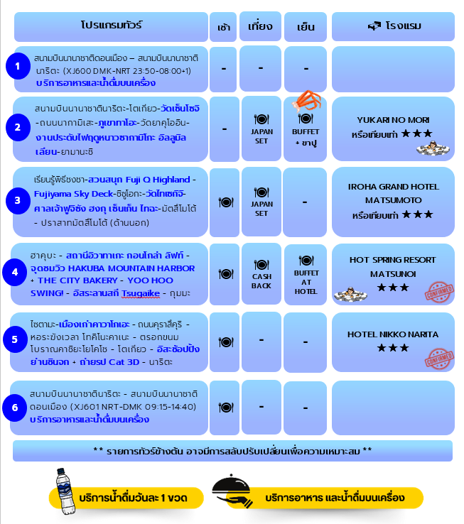 วัดเซ็นโซจิ, ถนนนากามิเสะ, ภูเขาทาคาโอะ, วัดยาคุโออิน, งานประดับไฟซากามิโกะ อิลลูมิลเลียน, ยามานะชิ, สวนสนุก Fuji Q Highland, Fujiyama Sky Deck, ชิซูโอกะ, วัดไทเซกิจิ, ศาลเจ้าฟูจิซัง ฮงกุ เซ็นเก็น ไทฉะ, มัตสึโมโต้, ปราสาทมัตสึโมโต้, ฮาคุบะ, สถานีอิวาทาเกะ กอนโดล่า ลิฟท์, จุดชมวิว HAKUBA MOUNTAIN HARBOR + THE CITY BAKERY, YOO HOO! SWING, อิสระลานสกี Tsugaike, กุมมะ, ไซตามะ, เมืองเก่าคาวาโกเอะ, ถนนคุราสึคุริ, หอระฆังเวลาโทคิโนะคาเนะ, ตรอกขนมโบราณคาชิยะโยโคโช, โตเกียว, อิสระช้อปปิ้งย่านชินจูกุ + ถ่ายรูป Cat 3D, นาริตะ