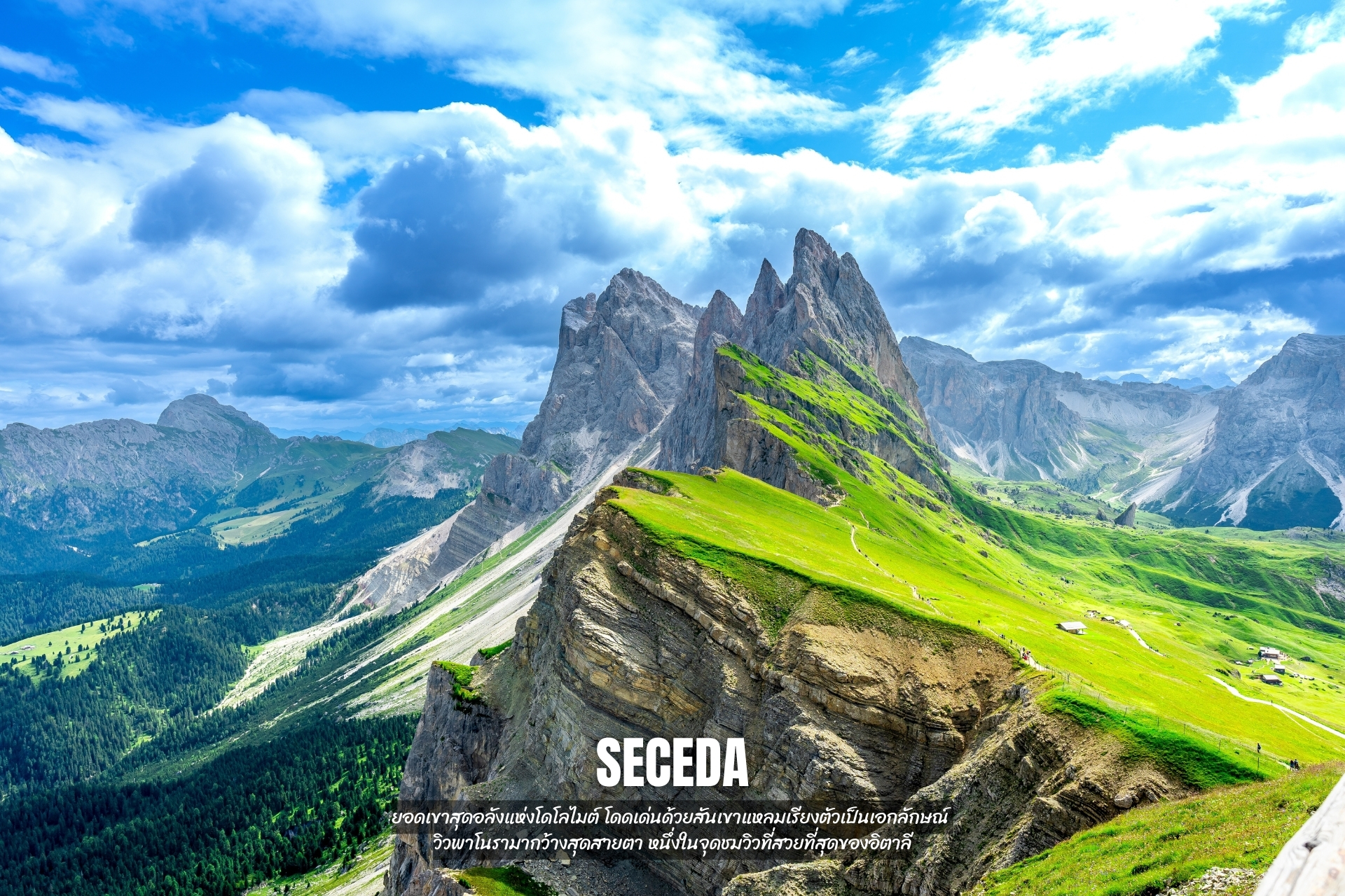 - นั่งกระเช้าพิชิต ยอดเขา Seceda ชมวิวทิวทัศน์บนทุ่งหญ้าราบเลียบบนภูเขา ท่านจะได้ชมยอดเขาแหลมเหมือนฟันฉลาม
