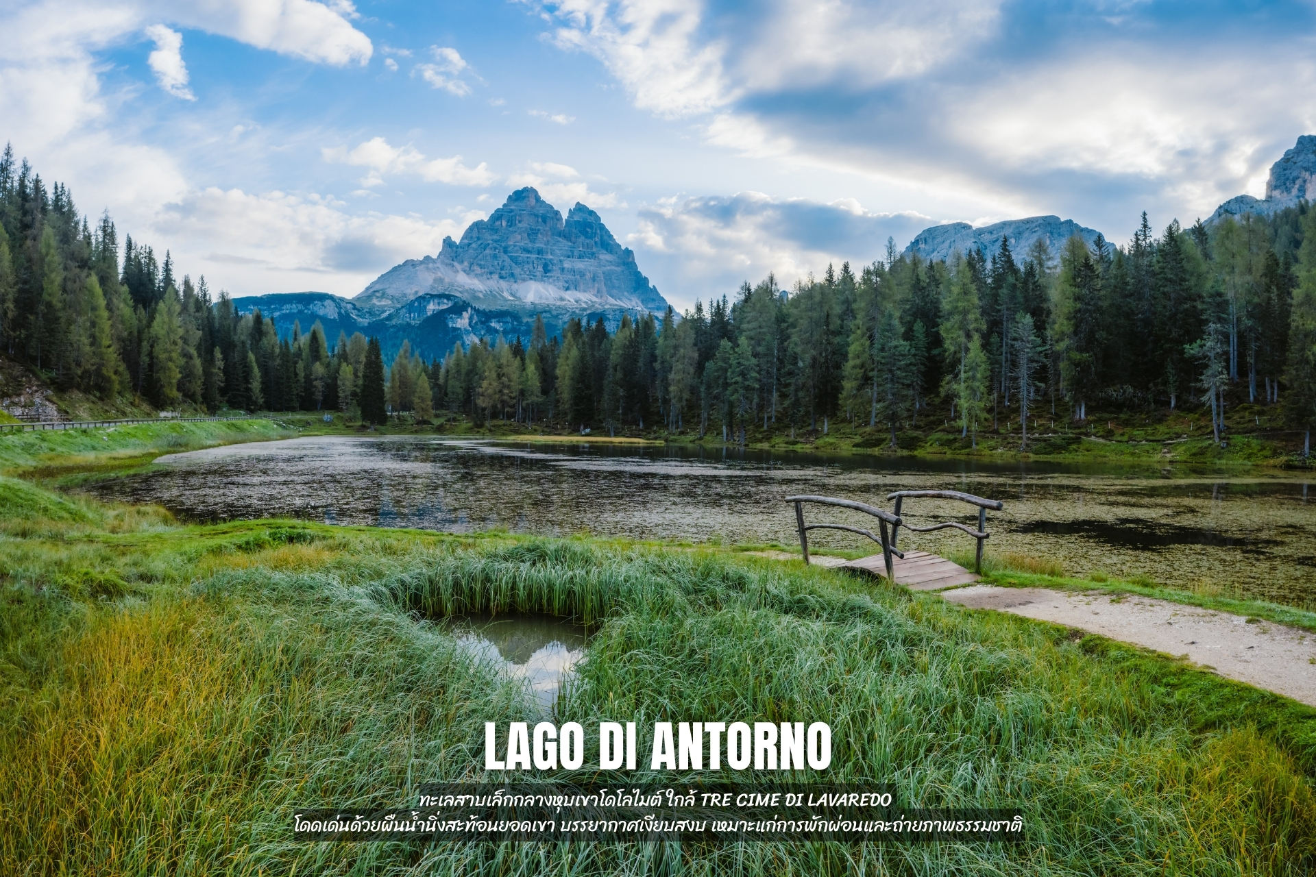 - ชม ทะเลสาบอันตอร์โน่ ทะเลสาบแสนสวยที่น้ำนิ่งจนเห็นภาพ Reflection ของน้ำและต้นไม้ ไปจนถึงด้านหลังของยอดเขาแลนด์มาร์คอย่าง Tre Cime