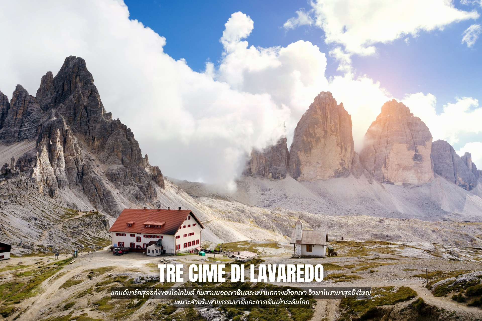 - เดินเขาเพื่อชมความงามของ หมู่ภูเขา Tre Cime di Lavaredo ยอดเขาที่มีชื่อเสียงและเป็นที่รู้จักกันดีในกลุ่มของเทือกเขาแอลป์