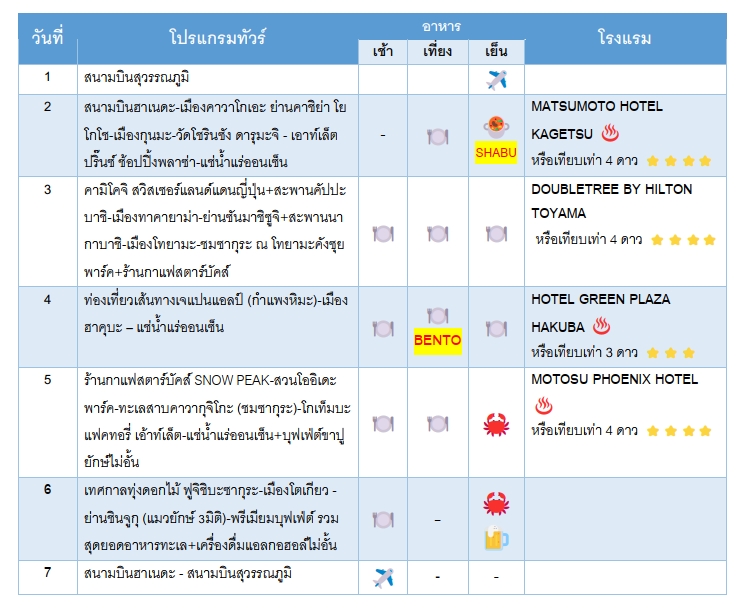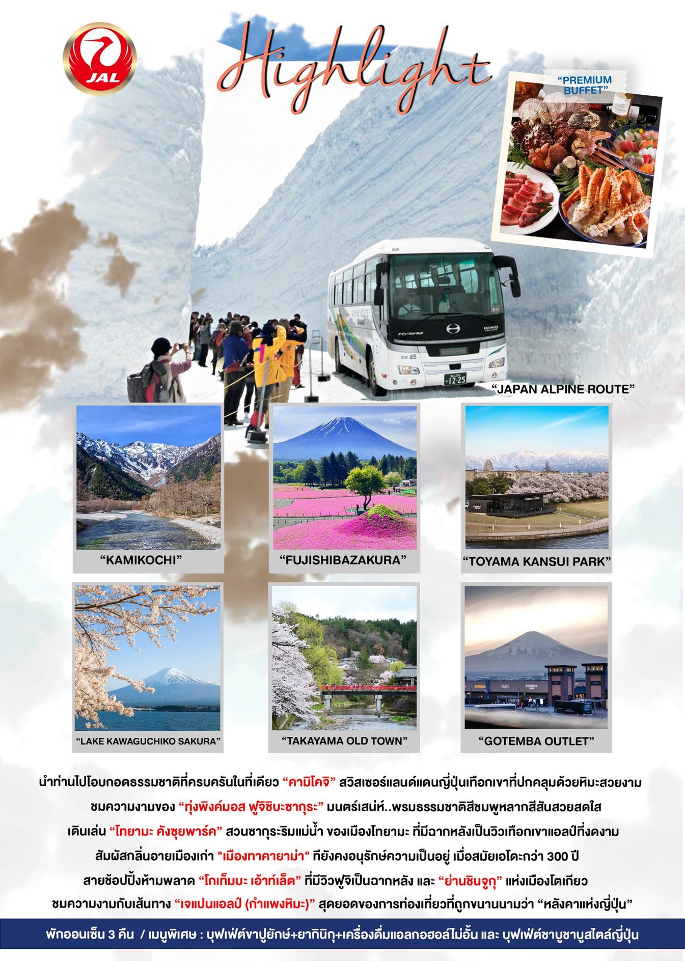 ไฮไลท์ทัวร์ Highlight : ท่องเที่ยวเส้นทางเจแปนแอลป์ (กำแพงหิมะ)/คามิโคจิ สวิสเซอร์แลนด์แดนญี่ปุ่น/ร้านกาแฟสตาร์บัคส์ SNOW PEAK/สวนโออิเดะพาร์ค/ทะเลสาบคาวากุจิโกะ (ชมซากุระ)/โกเท็มบะ แฟคทอรี่ เอ้าท์เล็ต