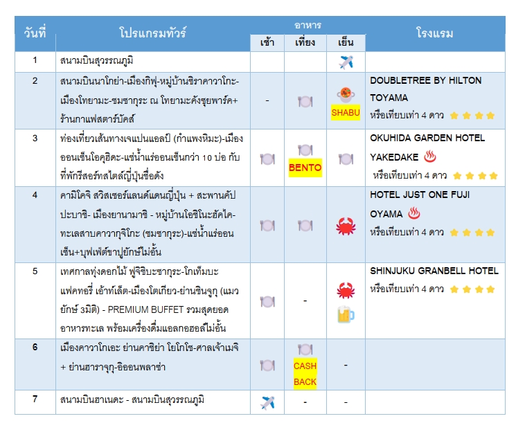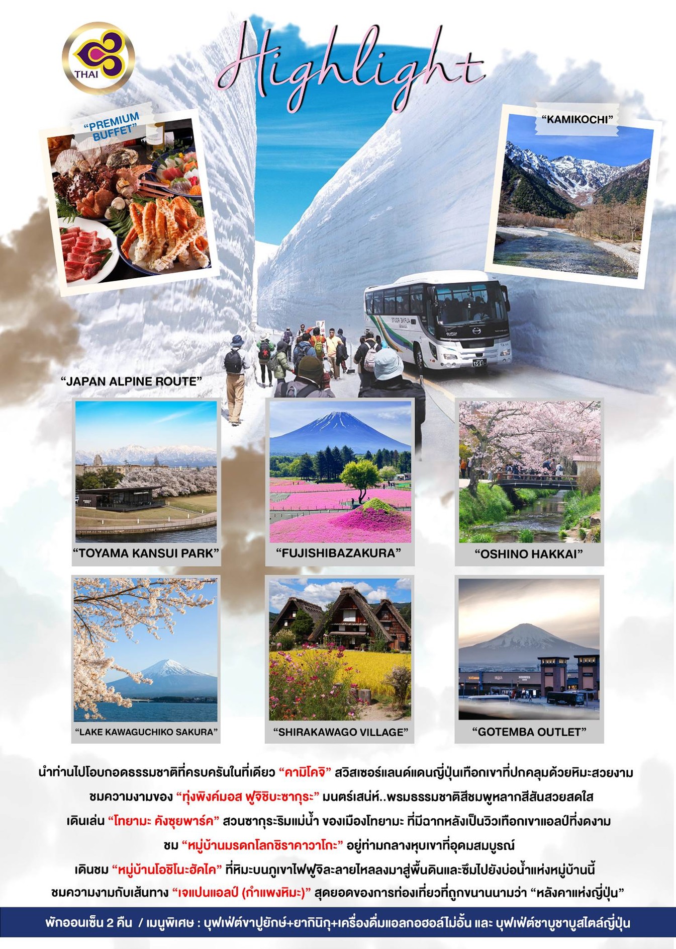 ไฮไลท์ทัวร์ Highlight : ท่องเที่ยวเส้นทางเจแปนแอลป์ (กำแพงหิมะ)/ชมซากุระ ณ โทยามะคังซุยพาร์ค/เมนูพิเศษ : "PREMIUM BUFFET" รวมสุดยอดอาหารทะเล พร้อมเครื่องดื่มแอลกอฮอล์ไม่อั้น