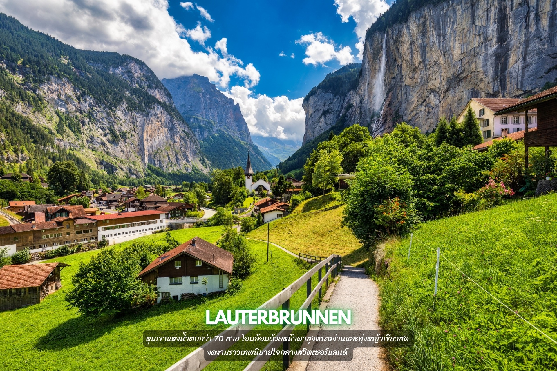 - ชม หมู่บ้าน Lauterbrunnen หมู่บ้านในหุบเขาอันเงียบสงบ โอบล้อมด้วยหน้าผาสูงและน้ำตกกว่า 70 แห่ง กลายเป็นหนึ่งในหุบเขาที่สวยที่สุดของสวิตเซอร์แลนด์ เพลิดเพลินกับธรรมชาติอันบริสุทธิ์และบรรยากาศโรแมนติกราวเทพนิยาย