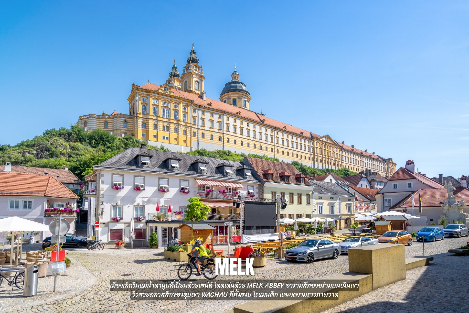 - เที่ยว Melk เมืองเล็กริมแม่น้ำดานูบที่เปี่ยมด้วยเสน่ห์ โดดเด่นด้วย Melk Abbey อารามสีทองอร่ามบนเนินเขา วิวสวยคลาสสิกของหุบเขา Wachau ที่ทั้งสงบ โรแมนติก และงดงามราวภาพวาด