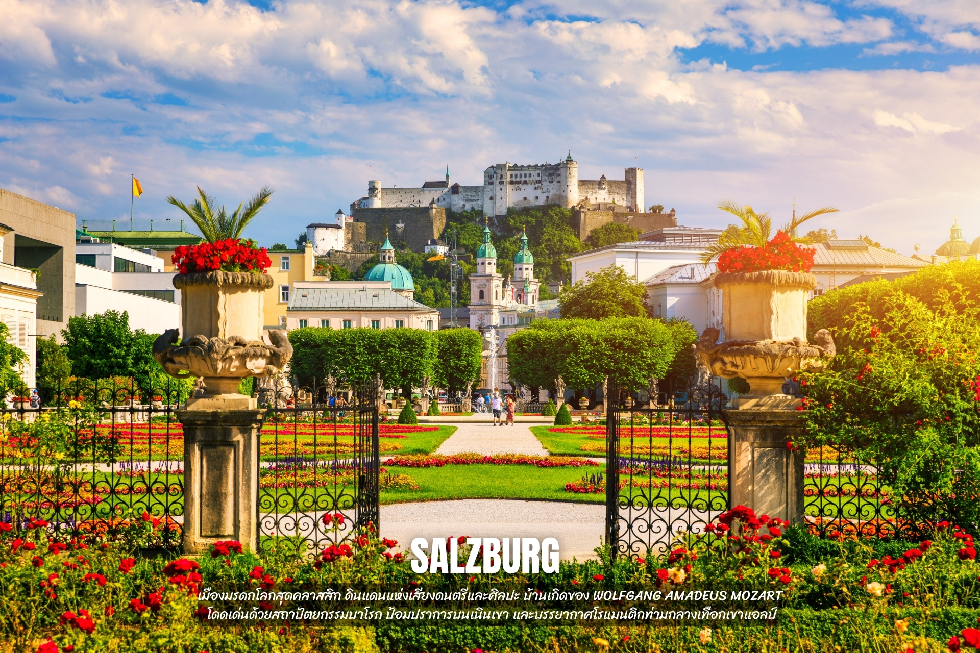 - เที่ยว Salzburg เมืองมรดกโลกสุดคลาสสิก ดินแดนแห่งเสียงดนตรีและศิลปะ บ้านเกิดของ Wolfgang Amadeus Mozart โดดเด่นด้วยสถาปัตยกรรมบาโรก ป้อมปราการบนเนินเขา และบรรยากาศโรแมนติกท่ามกลางเทือกเขาแอลป์