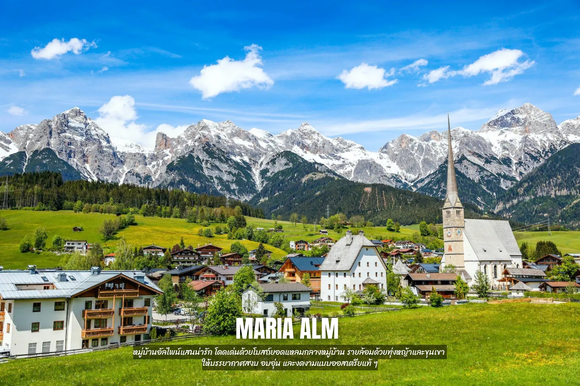 - เดินเล่น Maria Alm หมู่บ้านอัลไพน์แสนน่ารัก โดดเด่นด้วยโบสถ์ยอดแหลมกลางหมู่บ้าน รายล้อมด้วยทุ่งหญ้าและขุนเขา ให้บรรยากาศสงบ อบอุ่น และงดงามแบบออสเตรียแท้ ๆ