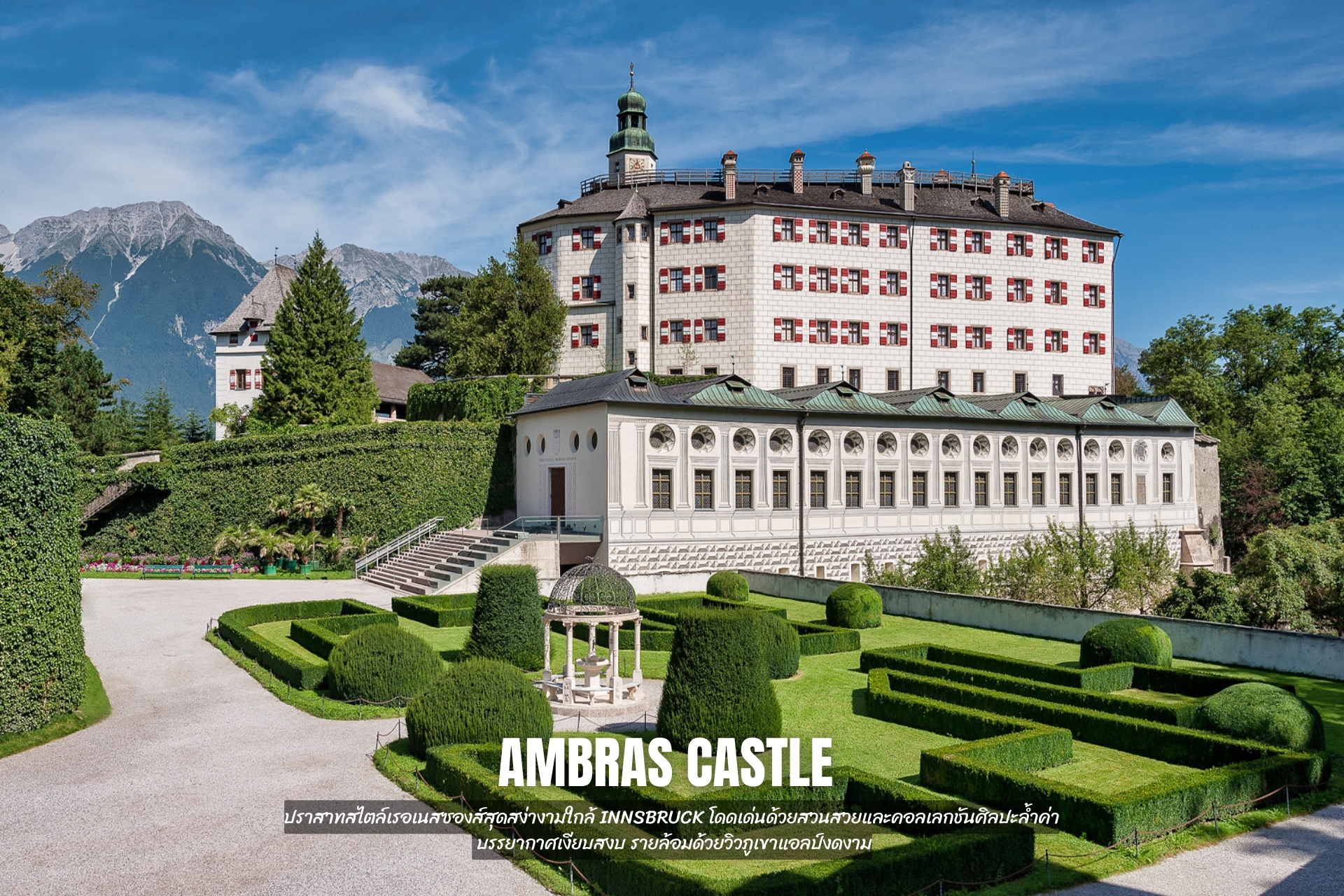 - เข้าชม Ambras Castle ปราสาทสไตล์เรอเนสซองส์สุดสง่างามใกล้ Innsbruck โดดเด่นด้วยสวนสวยและคอลเลกชันศิลปะล้ำค่า บรรยากาศเงียบสงบ รายล้อมด้วยวิวภูเขาแอลป์งดงาม