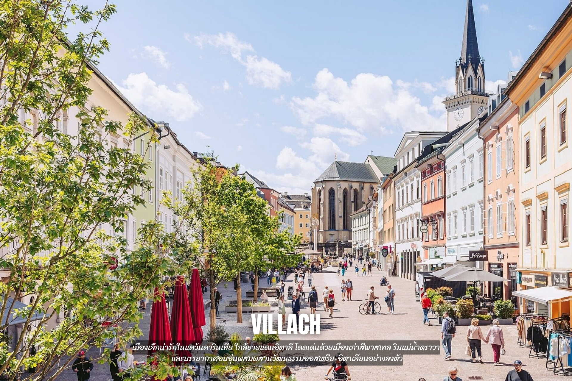 - เที่ยว Villach เมืองเล็กน่ารักในแคว้นคารินเทีย ใกล้ชายแดนอิตาลี โดดเด่นด้วยเมืองเก่าสีพาสเทล ริมแม่น้ำดราวา และบรรยากาศอบอุ่นผสมผสานวัฒนธรรมออสเตรีย-อิตาเลียนอย่างลงตัว