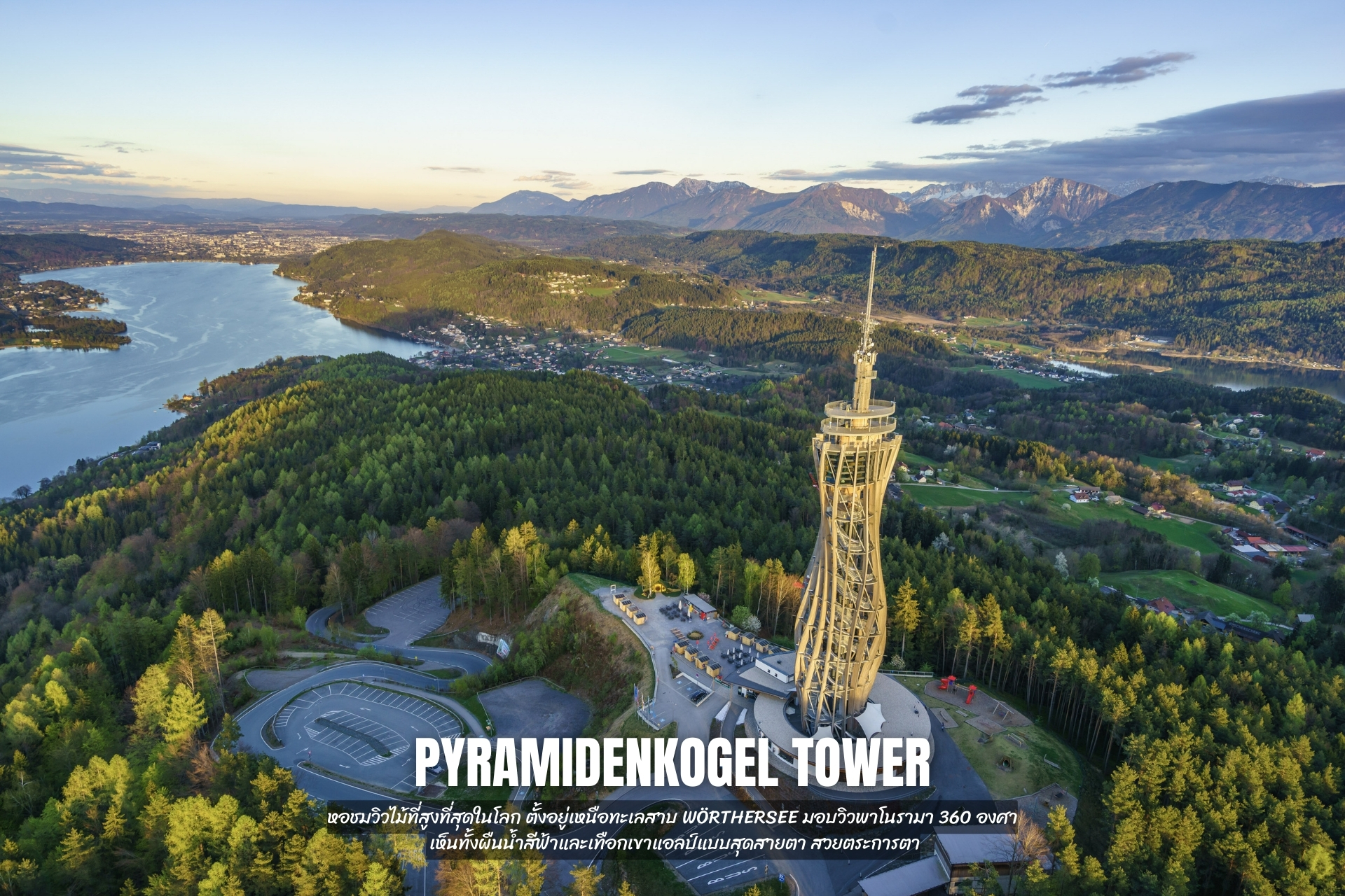 - ขึ้น Pyramidenkogel Tower หอชมวิวไม้ที่สูงที่สุดในโลก ตั้งอยู่เหนือทะเลสาบ Wörthersee มอบวิวพาโนรามา 360 องศา เห็นทั้งผืนน้ำสีฟ้าและเทือกเขาแอลป์แบบสุดสายตา สวยตระการตา