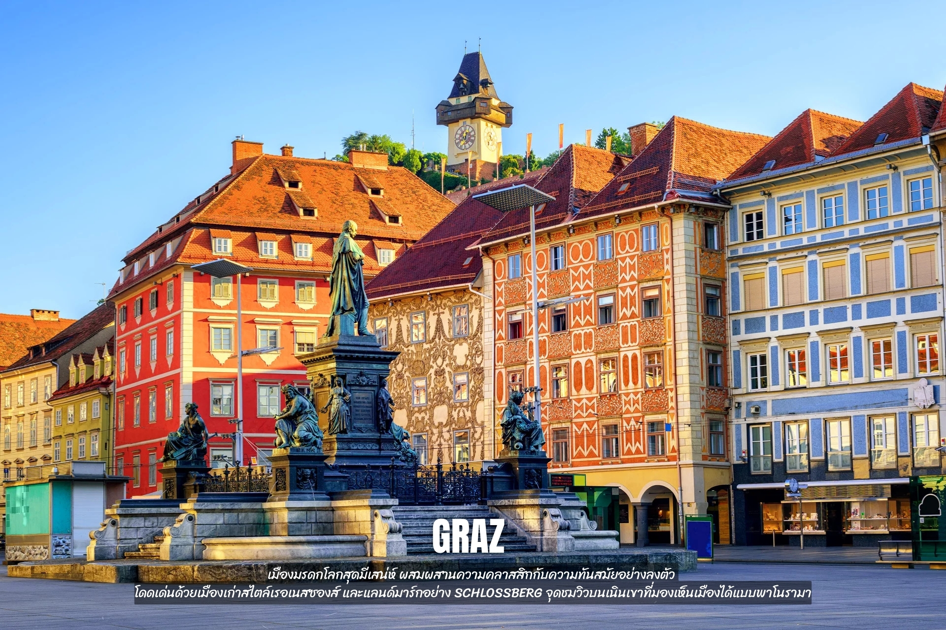- เที่ยว Graz เมืองมรดกโลกสุดมีเสน่ห์ ผสมผสานความคลาสสิกกับความทันสมัยอย่างลงตัว โดดเด่นด้วยเมืองเก่าสไตล์เรอเนสซองส์ และแลนด์มาร์กอย่าง Schlossberg จุดชมวิวบนเนินเขาที่มองเห็นเมืองได้แบบพาโนรามา