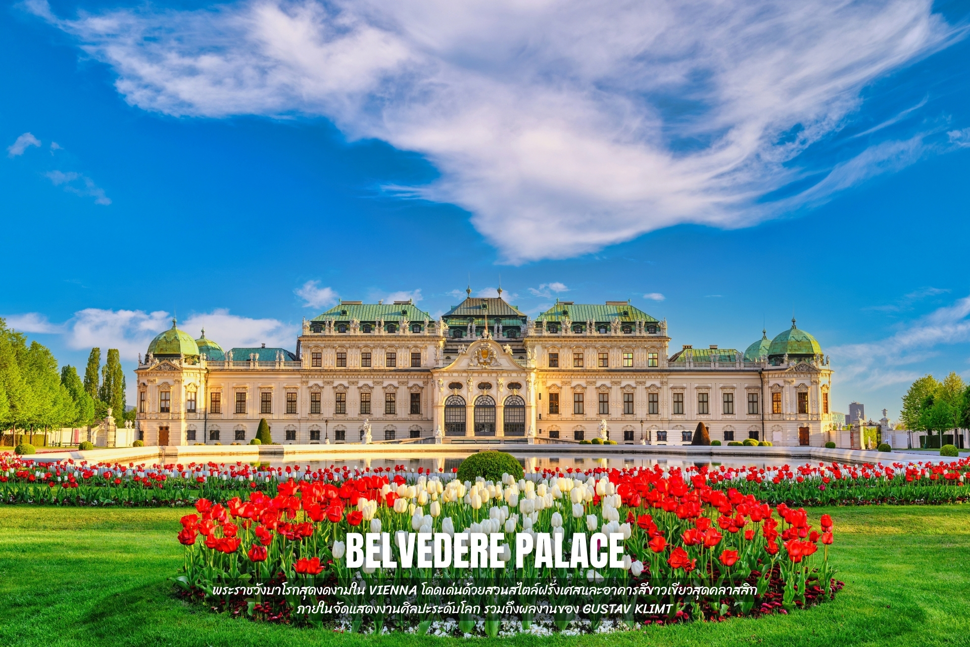 - เข้าชม Belvedere Palace พระราชวังบาโรกสุดงดงามใน Vienna โดดเด่นด้วยสวนสไตล์ฝรั่งเศสและอาคารสีขาวเขียวสุดคลาสสิก ภายในจัดแสดงงานศิลปะระดับโลก รวมถึงผลงานของ Gustav Klimt