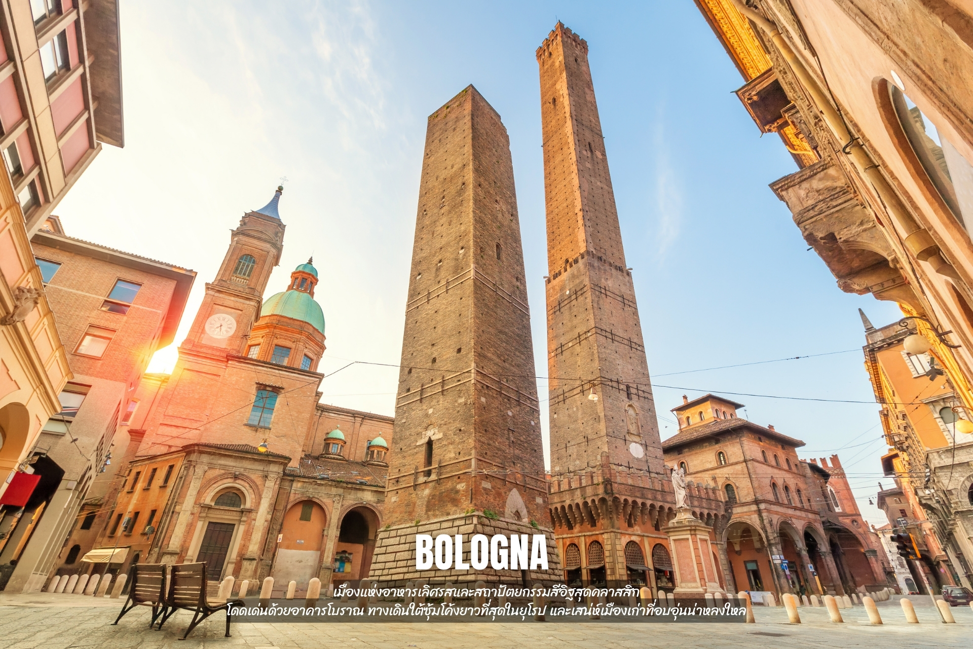 - เที่ยว Bologna เมืองสีแดงอันทรงเสน่ห์ของอิตาลี โดดเด่นด้วยอาคารอิฐเก่า ซุ้มระเบียงทอดยาว และบรรยากาศเมืองเก่าที่ผสานกับความทันสมัย พร้อมลิ้มรสอาหารขึ้นชื่ออย่างโบโลเนสแท้ ๆ