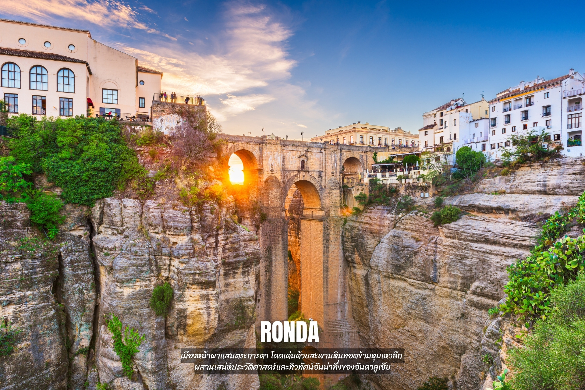 - ชม Ronda หนึ่งในสถานที่ที่ซ่อนเสน่ห์และเอกลักษณ์เอาไว้ ทั้งความงดงามของธรรมชาติและกลิ่นอายวัฒนธรรมโบราณที่หลอมรวมกัน จนกลายเป็นหนึ่งในเมืองที่สวยที่สุดในสเปน และอาคารบ้านเรือนแทบทั้งเมืองเป็นสีขาว