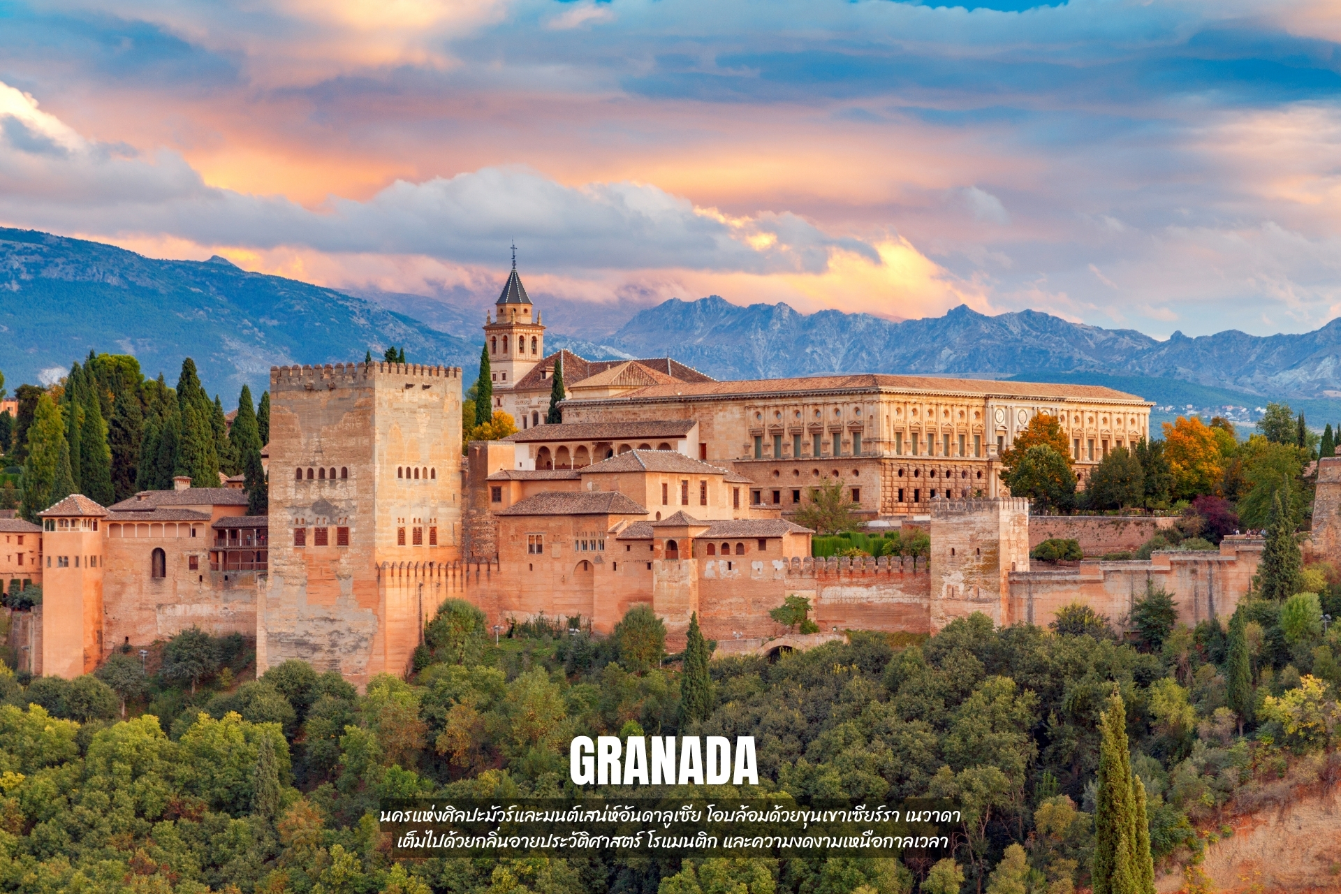 - เที่ยว Granada เมืองสวยโดดเด่นด้วยพระราชวัง Alhambra วังมรดกโลก ตั้งอยู่บนเนินและล้อมรอบด้วยเทือกเขา Sierra Nevada อย่างสวยงาม เมืองนี้เคยปกครองโดยชาวแขกมัวร์ ทำให้สถาปัตยกรรมที่นี่มีทั้งแนวแขกและฝรั่ง