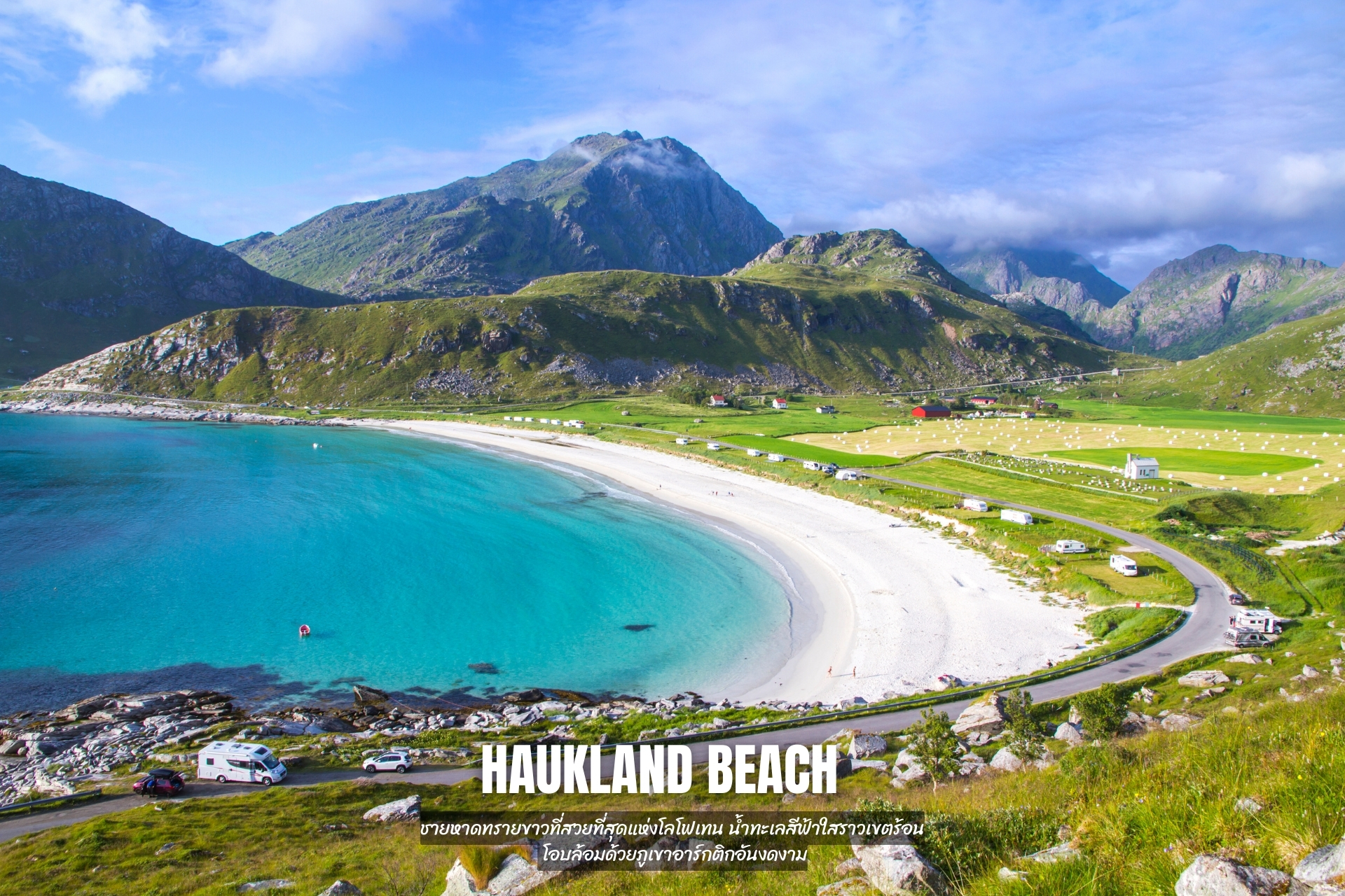 - ชมหาดสวย Haukland Beach ชายหาดทรายขาวที่สวยที่สุดแห่งโลโฟเทน น้ำทะเลสีฟ้าใสราวเขตร้อน โอบล้อมด้วยภูเขาอาร์กติกอันงดงาม