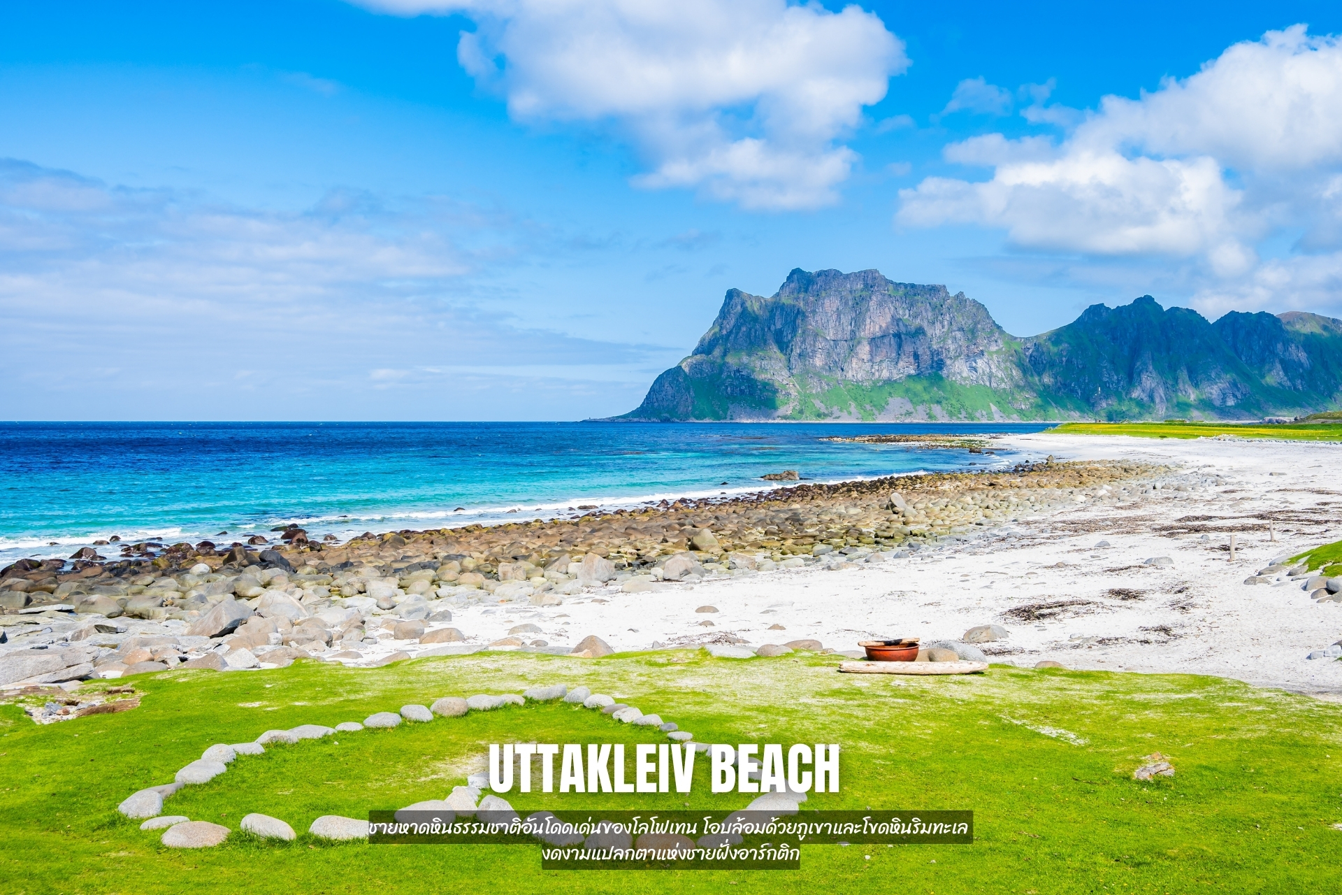 - หาด Uttakleiv Beach ชายหาดหินธรรมชาติอันโดดเด่นของโลโฟเทน โอบล้อมด้วยภูเขาและโขดหินริมทะเล งดงามแปลกตาแห่งชายฝั่งอาร์กติก