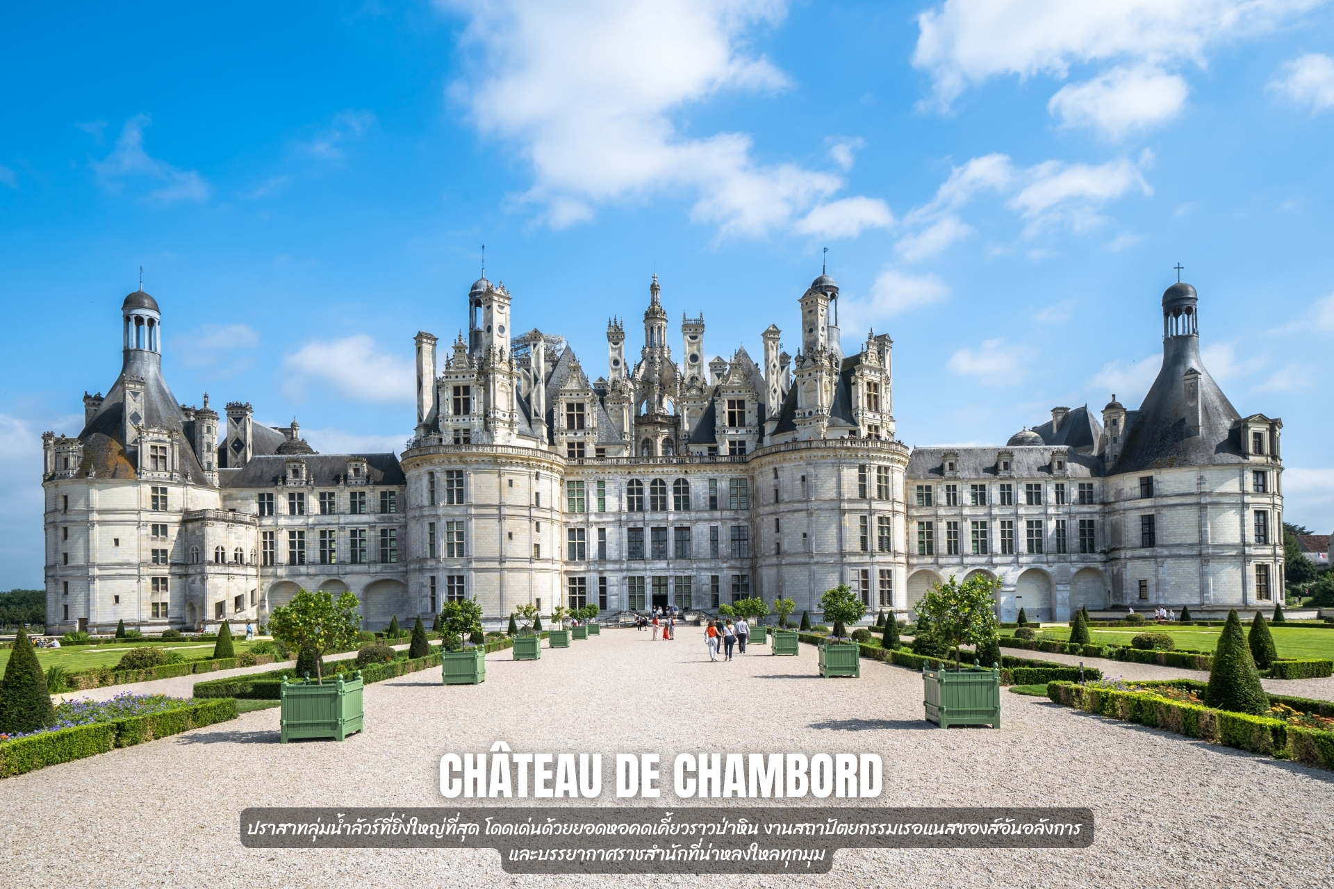 - ชม Château de Chambord ปราสาทลุ่มน้ำลัวร์ที่ยิ่งใหญ่ที่สุด โดดเด่นด้วยยอดหอคดเคี้ยวราวป่าหิน งานสถาปัตยกรรมเรอแนสซองส์อันอลังการ และบรรยากาศราชสำนักที่น่าหลงใหลทุกมุม