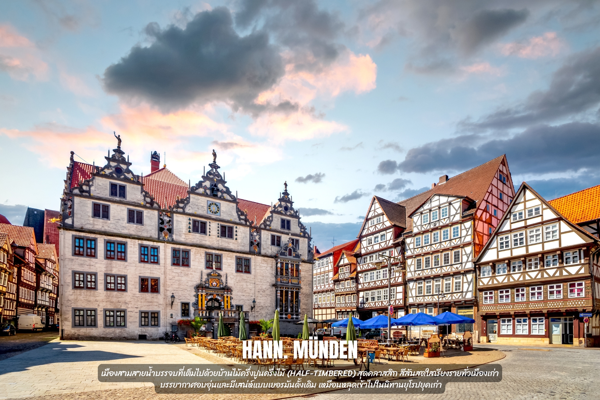 - เที่ยว Hann. Münden เมืองสามสายน้ำบรรจบที่เต็มไปด้วยบ้านไม้ครึ่งปูนครึ่งไม้ (Half-timbered) สุดคลาสสิก สีสันสดใสเรียงรายทั่วเมืองเก่า บรรยากาศอบอุ่นและมีเสน่ห์แบบเยอรมันดั้งเดิม เหมือนหลุดเข้าไปในนิทานยุโรปยุคเก่า